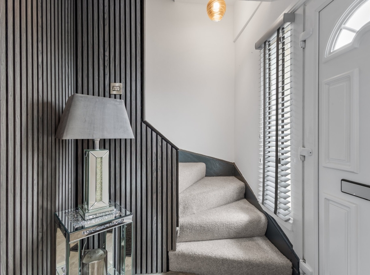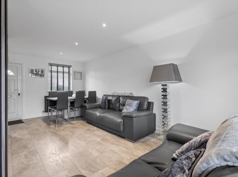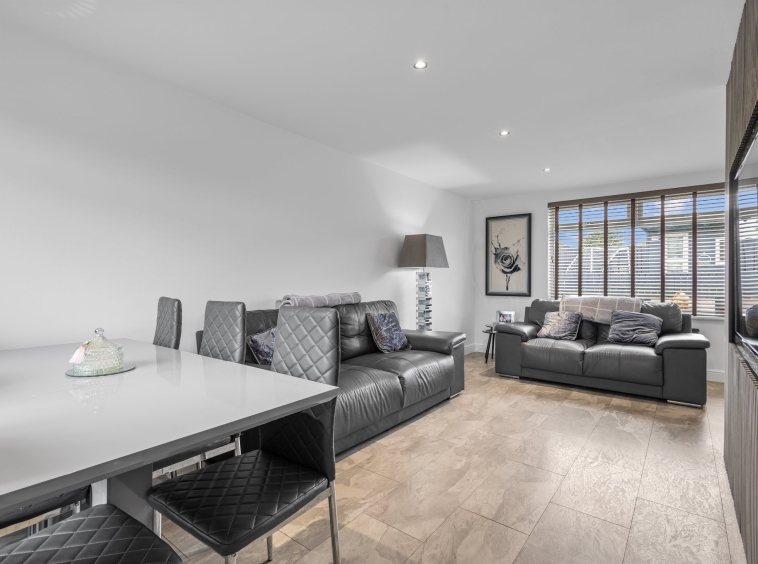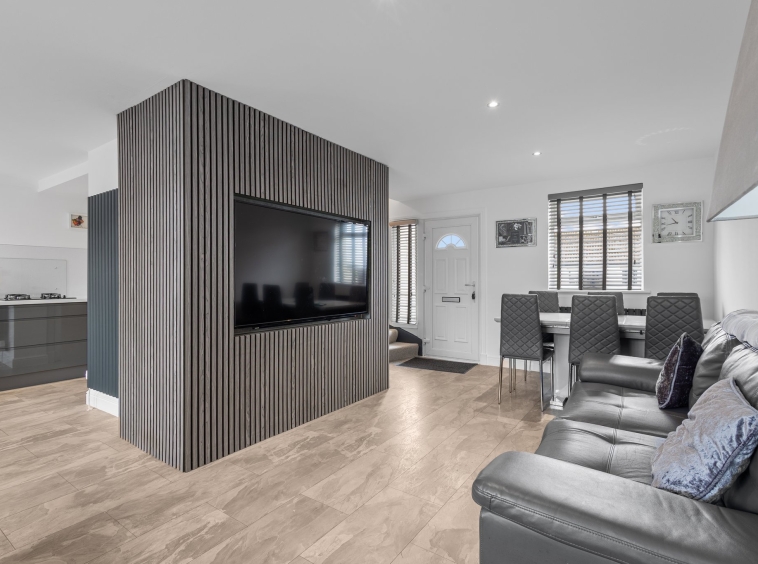 6.20m x 3.59m (20′ 4″ x 11′ 9″) The formal lounge boasts a contemporary open plan layout to the kitchen, complete with modern decor with crisp white wall finishes and feature acoustic wall panelling around TV area. Laminate flooring, ceiling spotlights, dual aspect double glazed windows to the front and rear, carpeted staircase leading to the upper level. Ample space for dining furniture.