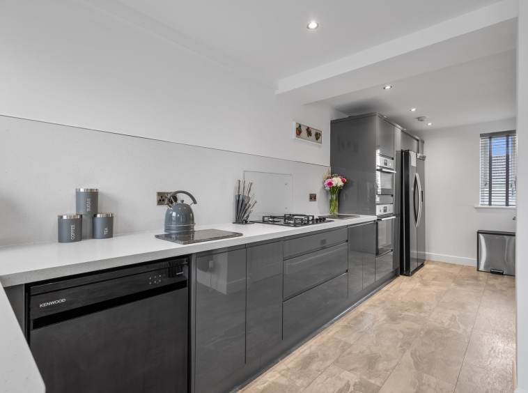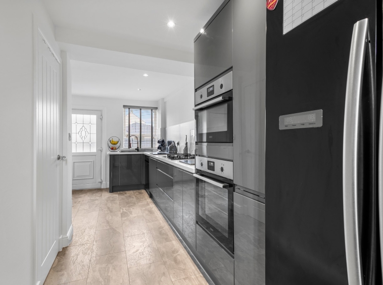 6.21m x 2.77m (20′ 4″ x 9′ 1″) Stylish and generous fitted kitchen providing a wide range of grey gloss wall and base storage units with complementary work surfaces, composite sink and drainer, integrated appliances including double oven and gas hob. Space for American style fridge/freezer and dishwasher, sizeable understairs storage cupboard with plumbing/space for washing machine and tumble dryer, modern splashback and ceiling spotlights. Neutral decor, laminate flooring, dual aspect double glazed windows to the front and rear, door leading out into the rear gardens. Open access to lounge.