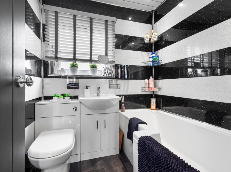 1.81m x 1.79m (5′ 11″ x 5′ 10″) Completing the accommodation is the three piece family bathroom comprising of a wash hand basin with vanity storage, wc and bath with overhead mains shower. Contemporary wet wall finish to walls, vinyl flooring, heated towel rail and ceiling spotlights. Double glazed opaque window to the rear.