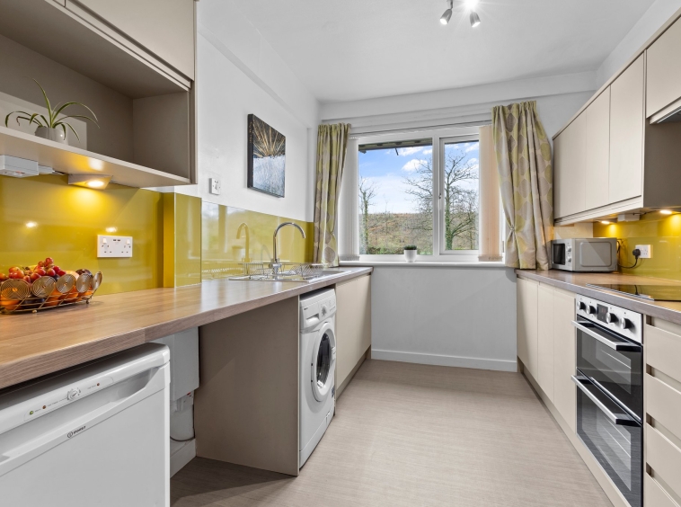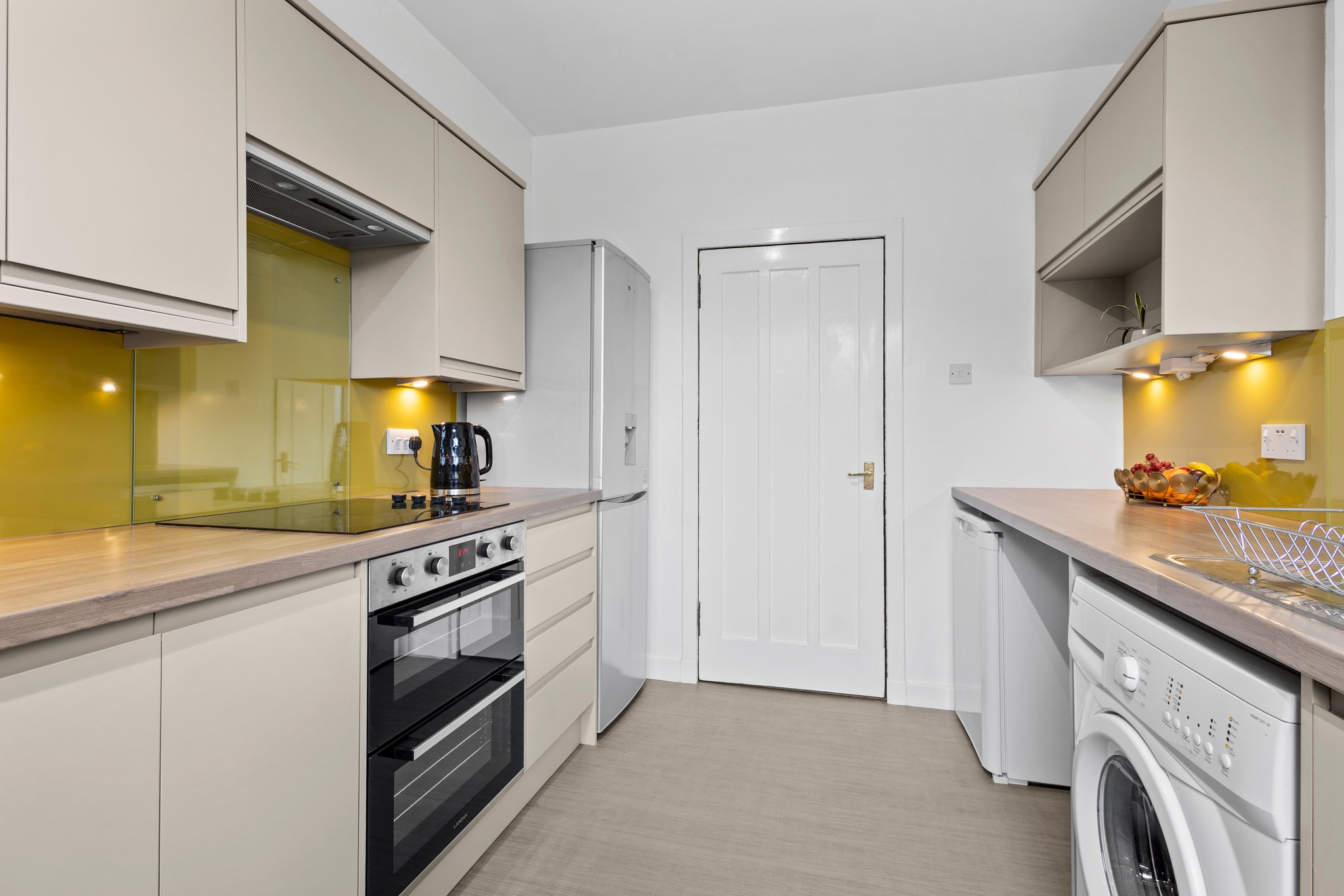 3.19m x 2.53m (10′ 6″ x 8′ 4″) Fully fitted kitchen complete with modern wall and base units providing ample storage with complimentary work surface, plumbing and space for an oven, electric hob, plumbing and space for a washing machine and fridge freezer, stainless steel sink and drainer, neutral decor with stylish splashback, vinyl flooring and a double glazed window to the front.