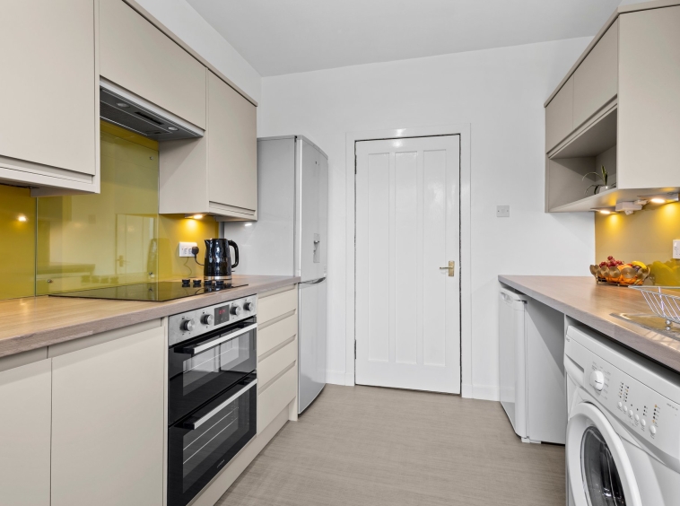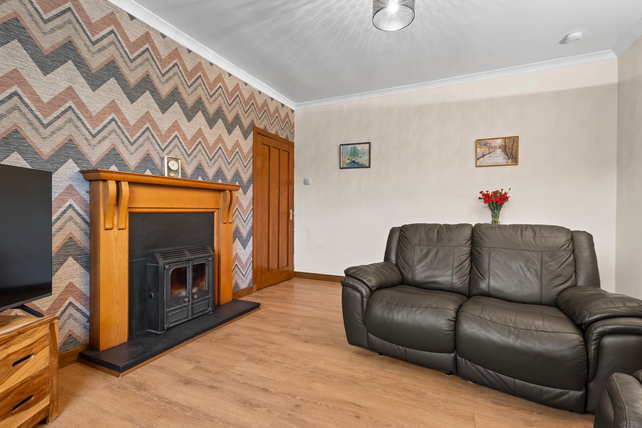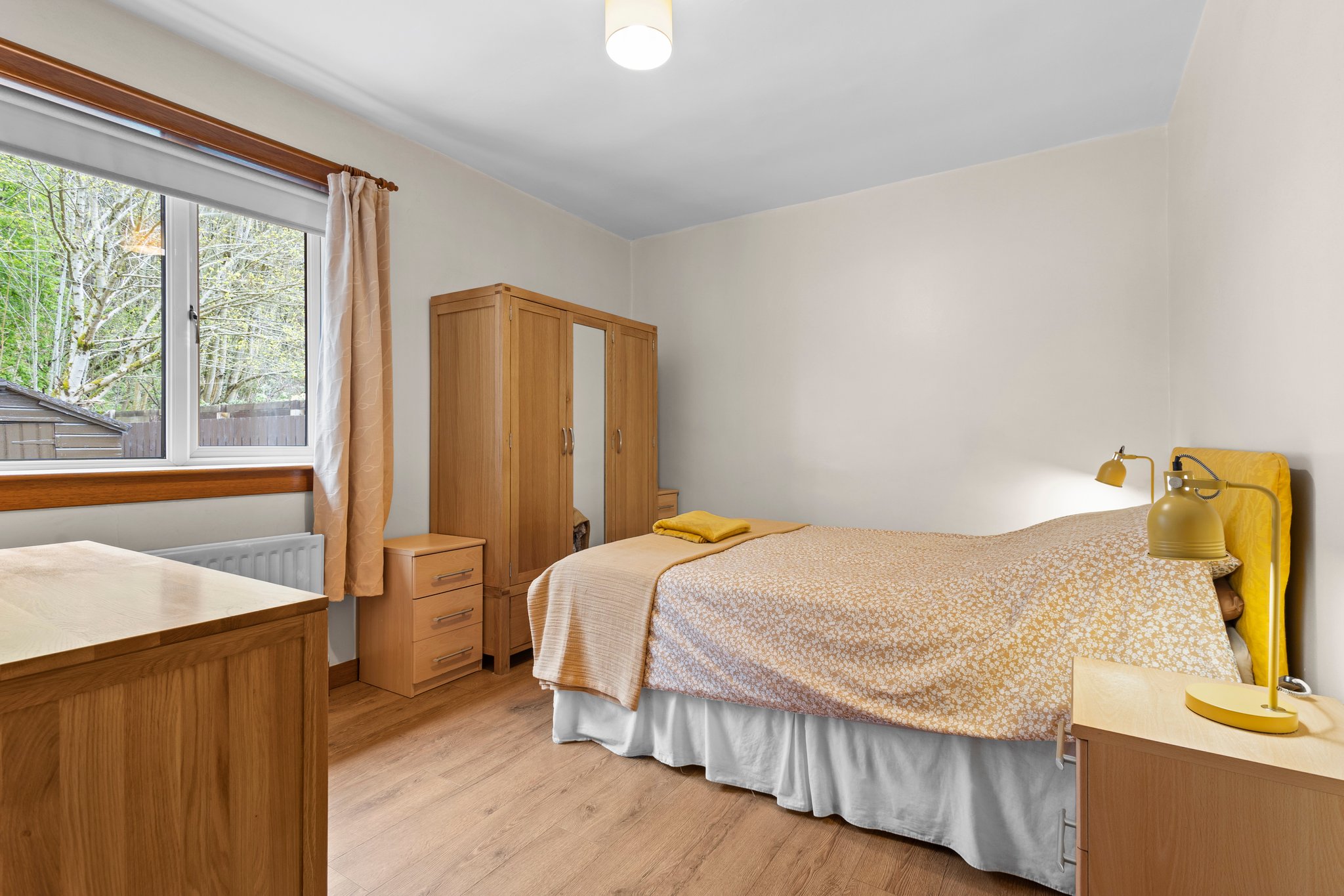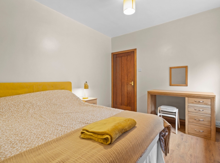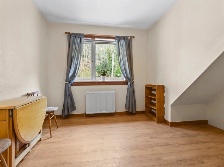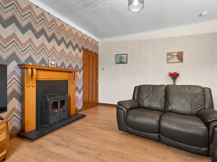 4.42m x 4.09m (14′ 6″ x 13′ 5″) Generously proportioned main apartment boasting neutral decor, feature fireplace with stunning solid wood surround, ceiling coving, traditional Edinburgh press, laminate flooring and a double glazed window to the front.