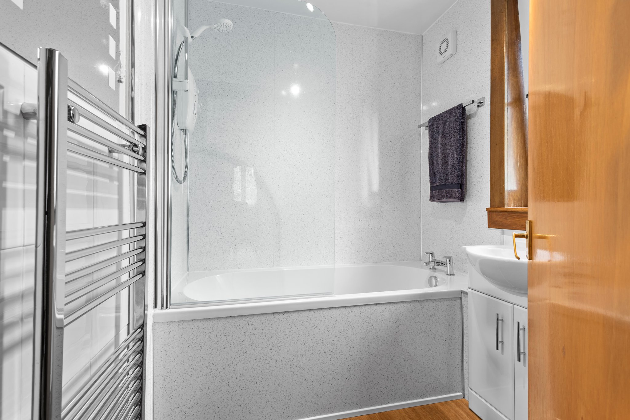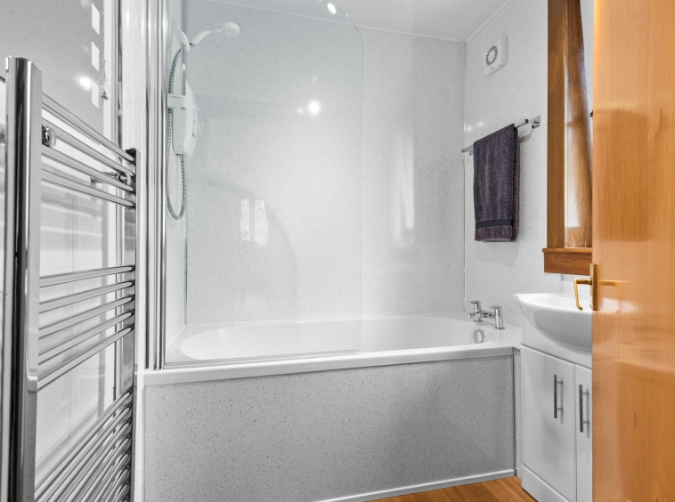 1.88m x 1.71m (6′ 2″ x 5′ 7″) Completing the accommodation is the family bathroom comprising of a wash hand basin, wc, bath with overhead electric shower, neutral decor with stylish wet wall in shower, heated towel rail, laminate flooring and a double glazed window to the side.
