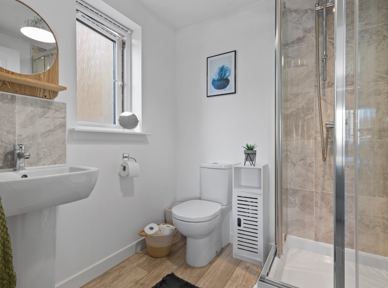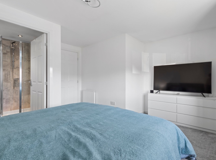 1.75m x 1.78m (5′ 9″ x 5′ 10″) Stylish en-suite comprising of a wash hand basin, wc, shower cubicle with mains shower, heated towel rail, modern decor, tiled finish around shower, vinyl flooring and a double glazed window to the side.