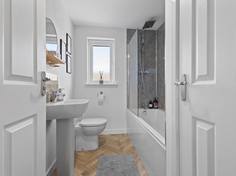 1.81m x 2.52m (5′ 11″ x 8′ 3″) Completing the accommodation is the family bathroom comprising of a wash hand basin, wc, bath with overhead mains shower, modern decor with stylish half height tiling, practical storage cupboard, vinyl flooring and a double glazed window to the rear.