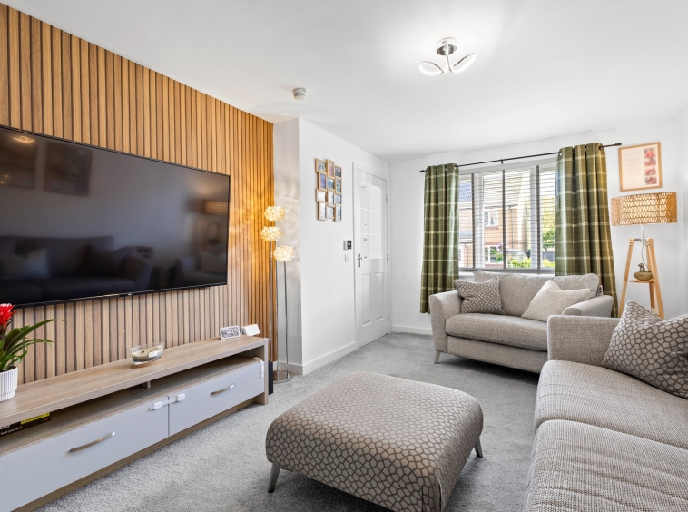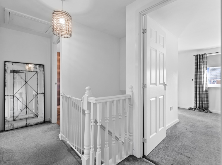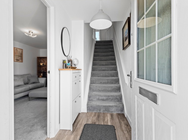 1.30m x 1.97m (4′ 3″ x 6′ 6″) Access is given to a welcoming spacious hallway boasting modern decor and laminate flooring. The hallway gives access to the lounge and a carpeted staircase leads to the upper level.