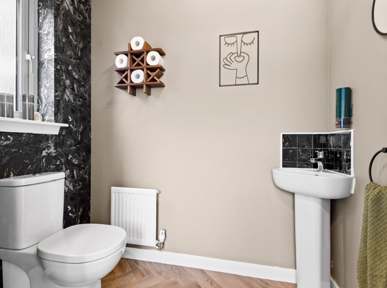 1.95m x 1.23m (6′ 5″ x 4′ 0″) Conveniently located on the lower level, the stylish wc/cloaks comprises of a wash hand basin, wc, modern decor, vinyl flooring and a double glazed window to the side.