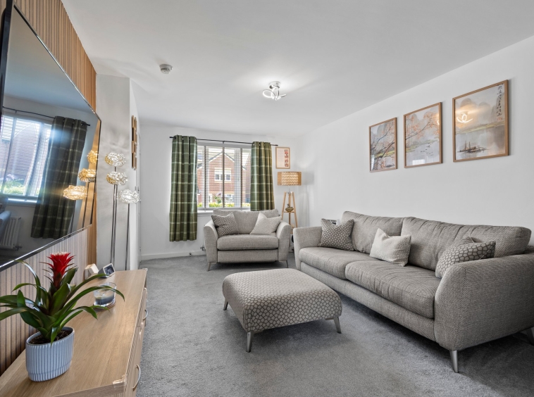 3.19m x 5.13m (10′ 6″ x 16′ 10″) Generously proportioned main apartment offering modern decor, plentiful space for free standing furniture, fitted carpet and a double glazed window to the front.