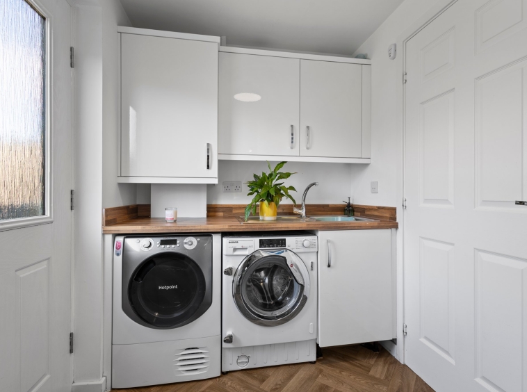 1.95m x 1.85m (6′ 5″ x 6′ 1″) Practical utility offering additional storage units, plumbing and space for washing machine and tumble drier, neutral decor and vinyl flooring.