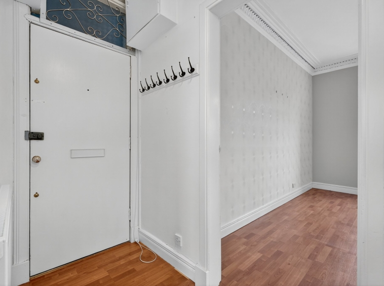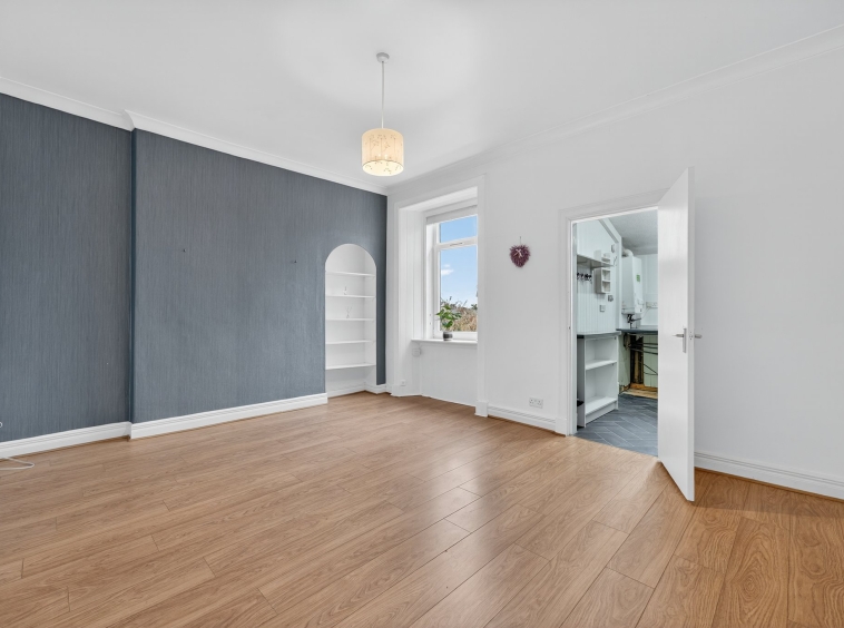 3.78m x 4.93m (12′ 5″ x 16′ 2″) Generously proportioned main apartment offering modern decor, traditional high ceiling, shelved alcove, ceiling coving, plentiful space for free standing furniture, laminate flooring and a double glazed window to the rear.