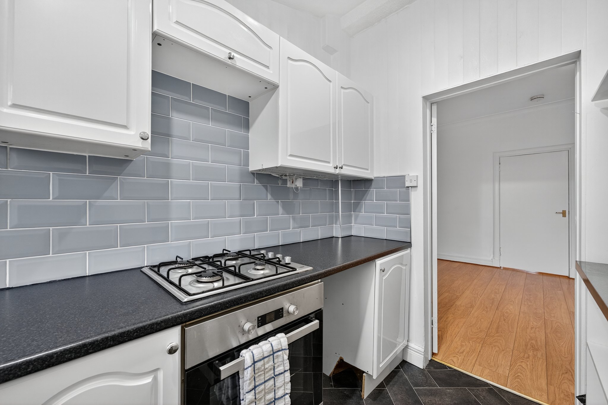 2.75m x 1.75m (9′ 0″ x 5′ 9″) Fully fitted kitchen complete with ample wall and base storage units, complimentary work surface, integrated oven, gas hob, plumbing and space for under counter fridge and washing machine, stainless steel sink and drainer, modern decor, vinyl flooring and a double glazed window to the rear.