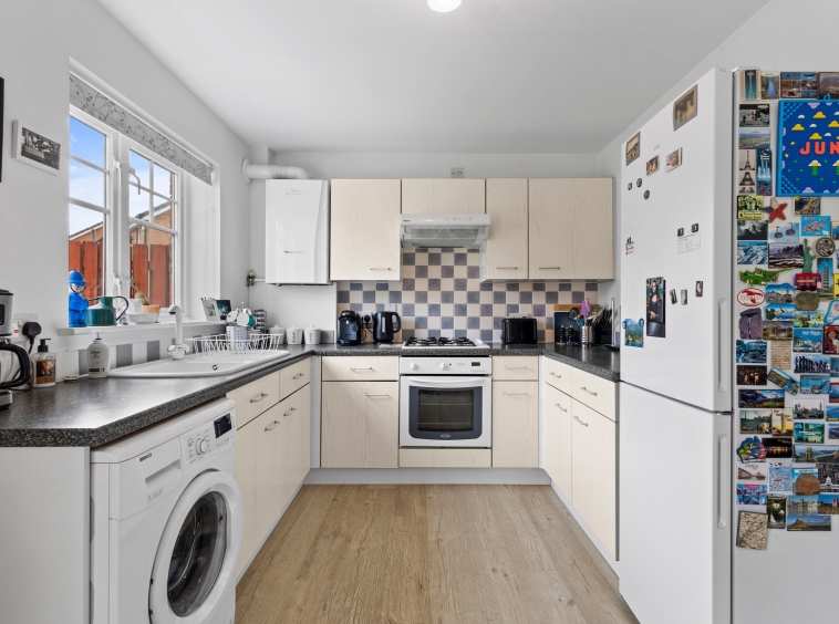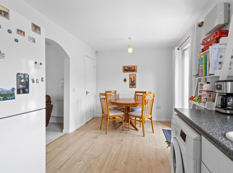 5.07m x 2.77m (16′ 8″ x 9′ 1″) Fully fitted kitchen complete with ample wall and base storage units, complimentary work surface, integrated oven, gas hob and hood, plumbing and space for fridge freezer and washing machine, composite sink and drainer, neutral decor, laminate flooring, double glazed window to the rear and French doors overlooking and providing access to the rear garden.