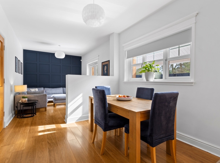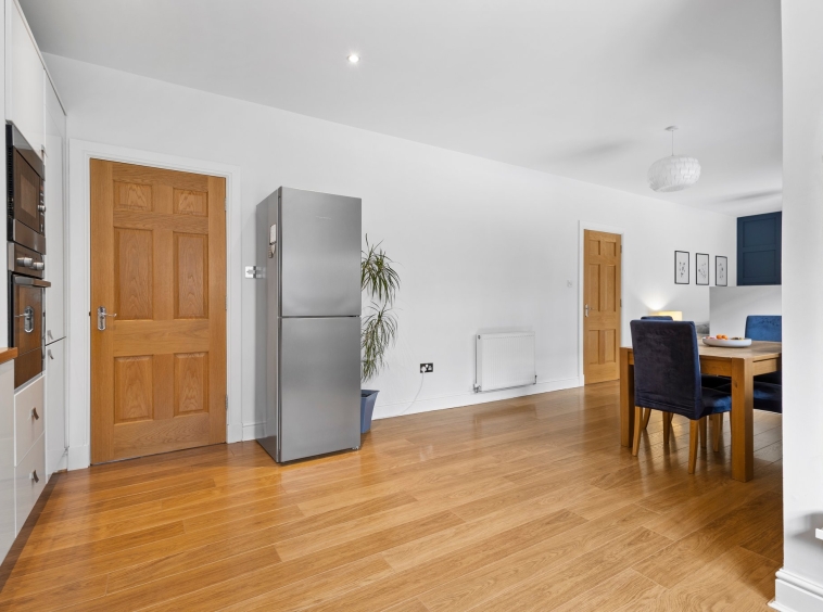 3.38m x 2.86m (11′ 1″ x 9′ 5″) Superb dining room boasting a stunning open plan living space with access to the kitchen and sitting room. Featuring neutral decor, plentiful space for dining table and chairs, laminate flooring and a double glazed window to the rear.