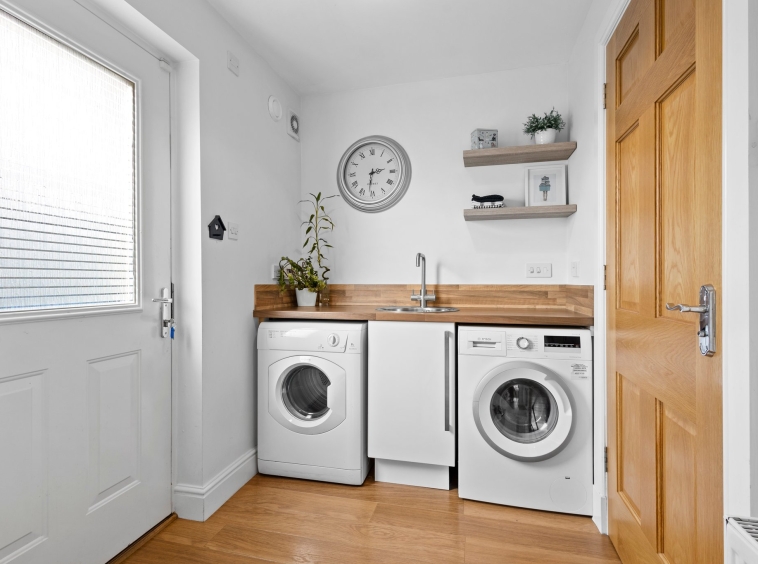 1.83m x 2.37m (6′ 0″ x 7′ 9″) Practical utility room offering additional work surface space, plumbing and space for a washing machine and tumble drier, stainless steel sink, neutral decor, laminate flooring and a door to the side.