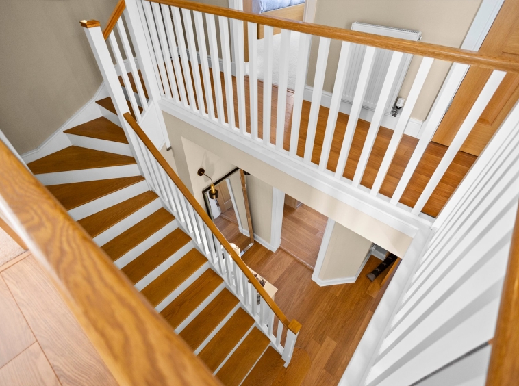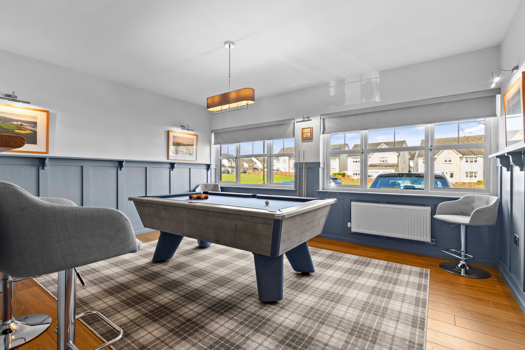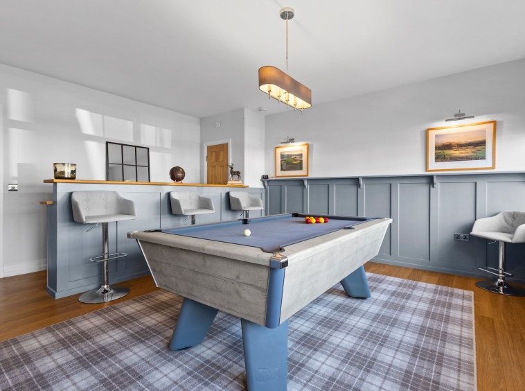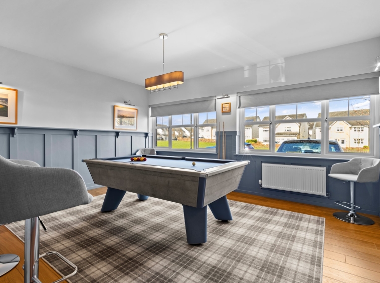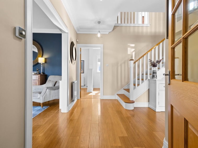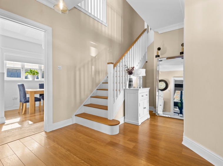 3.67m x 3.74m (12′ 0″ x 12′ 3″) Access is given to a welcoming grand entrance hallway offering stylish modern decor, practical storage cupboard and contemporary laminate flooring. The hallway gives access to the living room, open plan kitchen/dining and sitting room, games room, wc and a striking wood staircase leads to the upper level.
