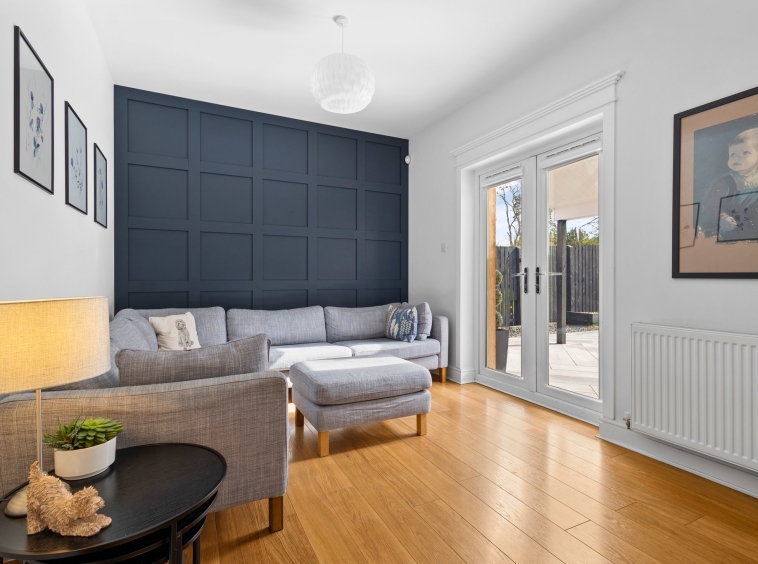3.98m x 2.85m (13′ 1″ x 9′ 4″) Offering additional family living space, the rear facing sitting room boasts a modern open plan layout, neutral decor with a striking bold wood panelled feature wall, laminate flooring and double glazed patio doors overlooking and leading to the rear garden.