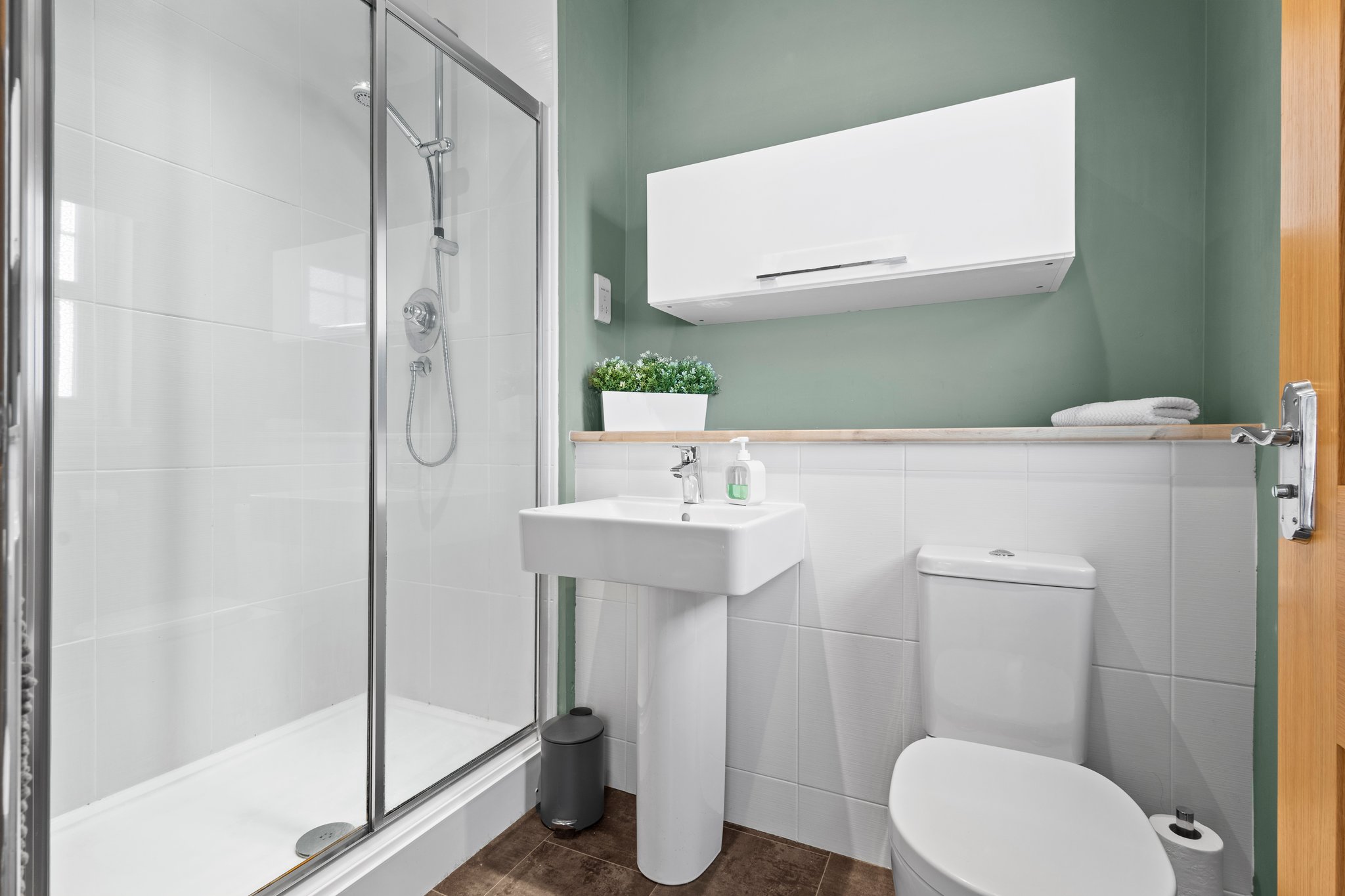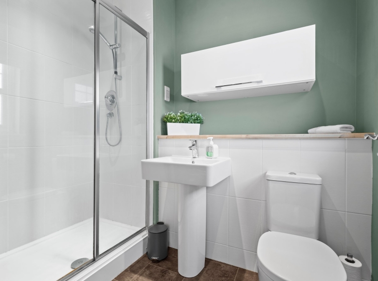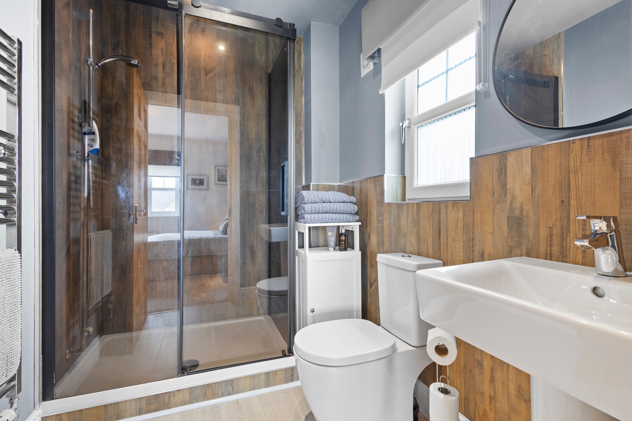 1.78m x 2.48m (5′ 10″ x 8′ 2″) Practical en-suite comprising of a wash hand basin, wc, shower cubicle with mains shower, modern decor with half height tiling, heated towel rail, ceiling spotlights, vinyl flooring and a double glazed window to the front.