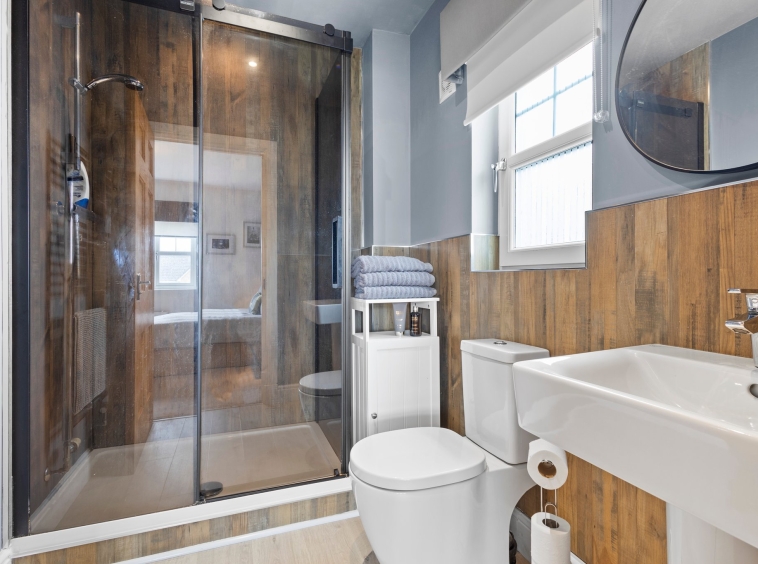 1.77m x 2.37m (5′ 10″ x 7′ 9″) Stylish en-suite offering a wash hand basin, wc, shower cubicle with mains shower, modern decor with a modern wet wall finish, heated towel rail, vinyl flooring and a double glazed window to the side.
