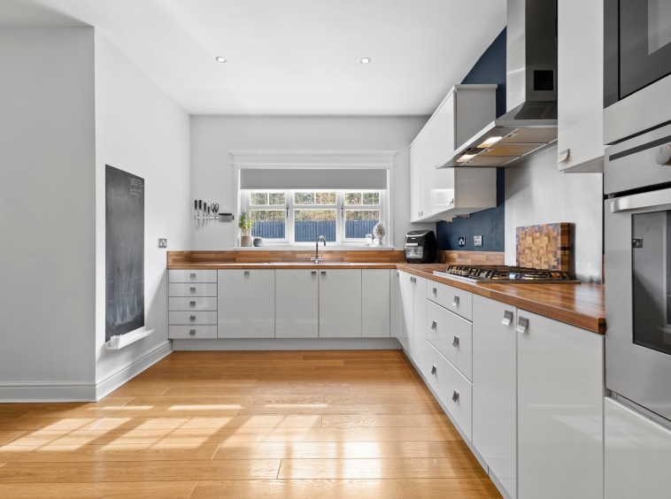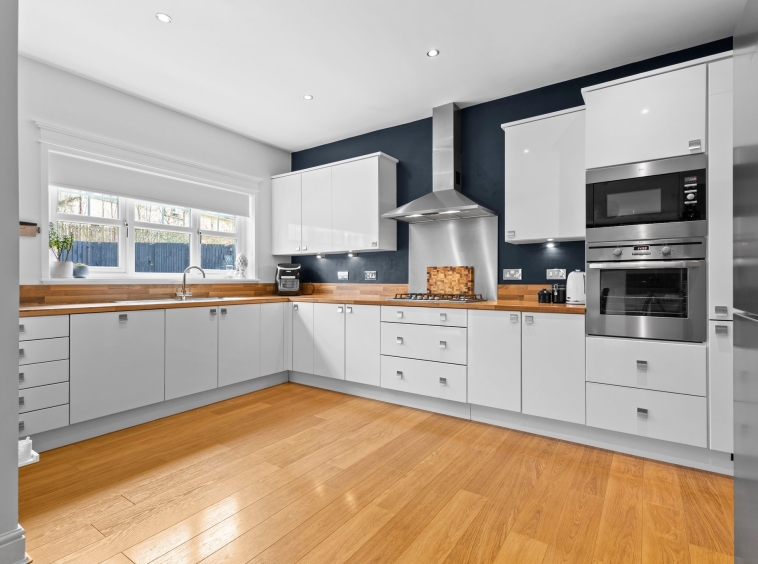 3.02m x 4.64m (9′ 11″ x 15′ 3″) Stylish fully fitted kitchen complete with a modern open plan layout to the dining and sitting room, offering contemporary wall and base units providing ample storage with complimentary work surface, integrated oven, gas hob, dish washer and microwave, stainless steel sink and drainer, modern decor, stylish laminate flooring, double glazed window to the rear.