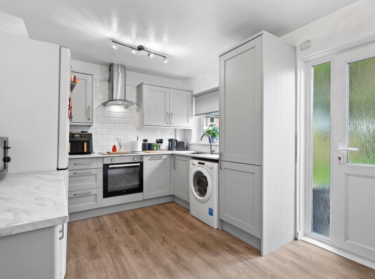 3.92m x 2.84m (12′ 10″ x 9′ 4″) Modern fitted kitchen offering an array of wall and base units, marble effect work surfaces, integrated induction hob, electric oven, integrated dishwasher, space for free standing fridge freezer and washing machine, stainless steel sink and drainer, white metro tiled splash back, vinyl flooring, double glazed window to the rear and outer UPVC opaque double glazed door giving access to the rear garden.