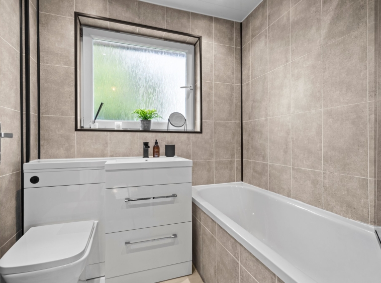 1.86m x 1.66m (6′ 1″ x 5′ 5″) Modern three piece bathroom, offering a WC, wash hand basin with vanity storage, mains shower over bath, tile effect wet wall finish, ceiling spotlights and double glazed opaque window to rear.