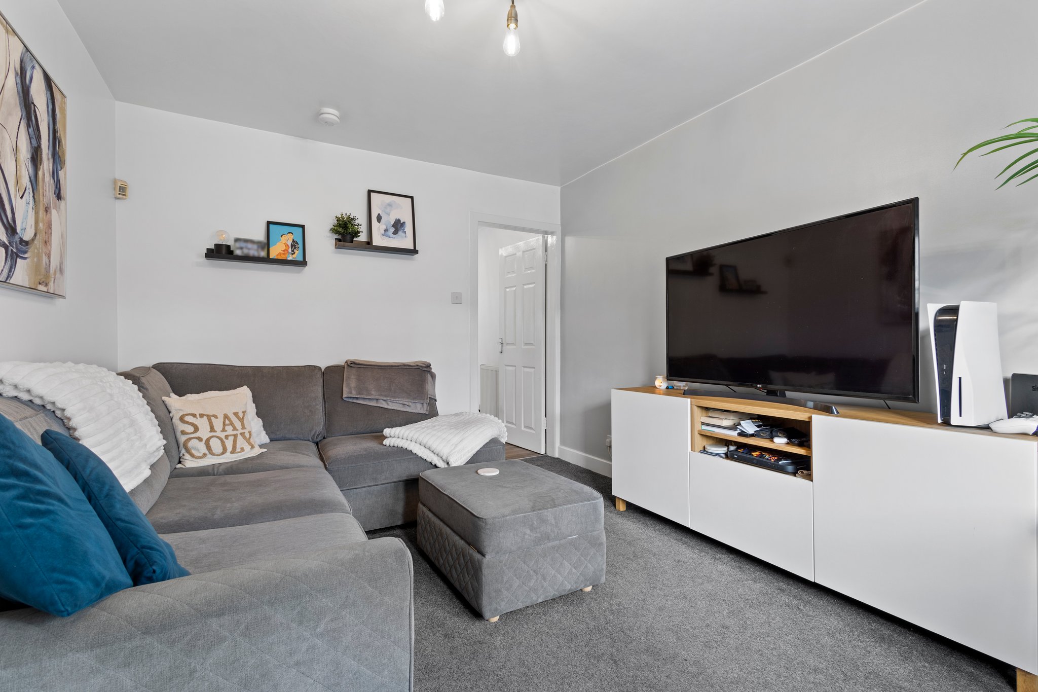 1.02m x 1.19m (3′ 4″ x 3′ 11″) Accessed via the outer white UPVC opaque double glazed door, crisp white decor, fitted carpet, door access to the living room and access to the upper level via carpeted staircase.