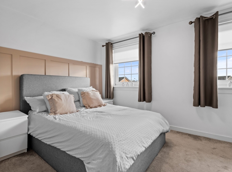 3.92m x 3.29m (12′ 10″ x 10′ 10″) Double bedroom offering crisp white decor with contrasting decorative panelling, fitted carpet, fitted double wardrobe, storage cupboard, two double glazed windows to the front.