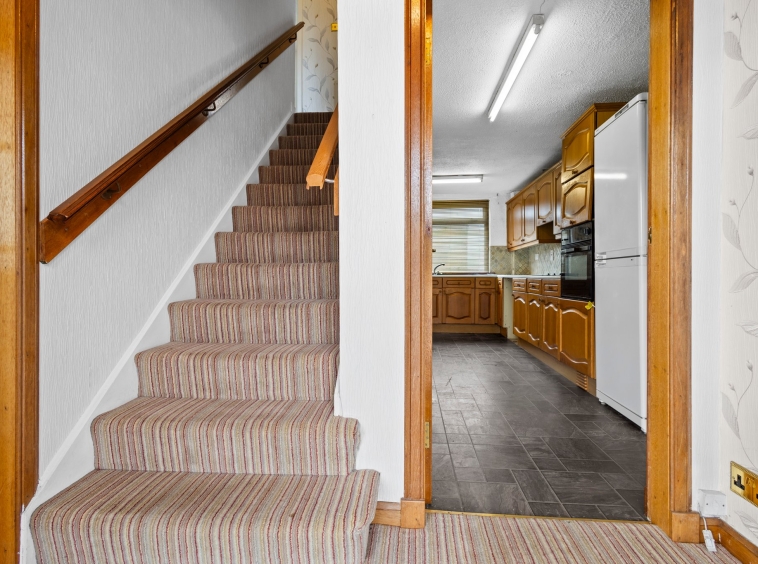 2.39m x 1.24m (7′ 10″ x 4′ 1″) Neutrally decorated hallway accessed via the outer opaque glazed door, fitted carpet, staircase leading the upper level door access to the kitchen and the livingroom.