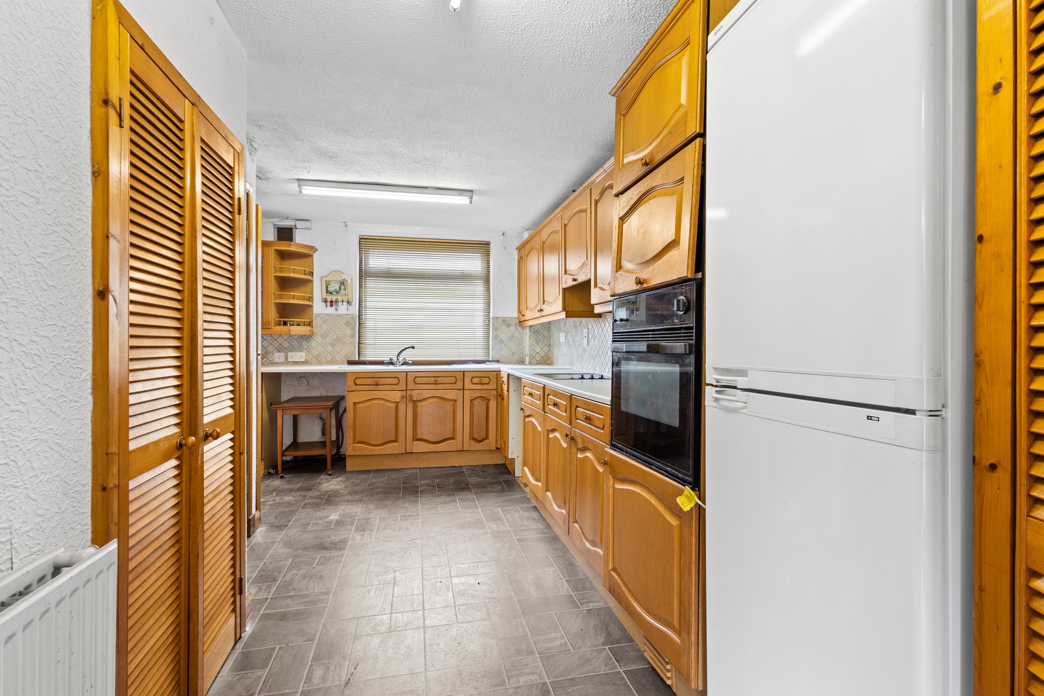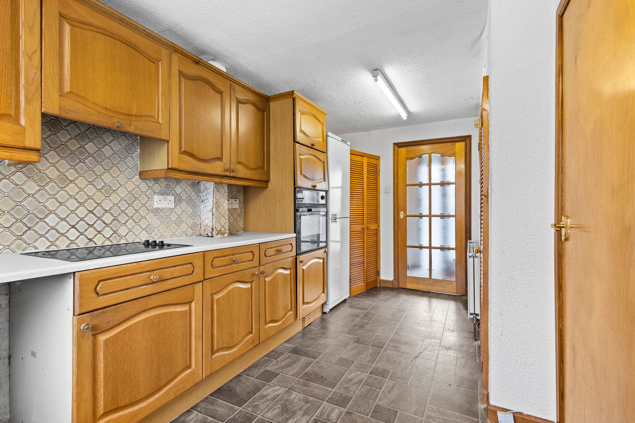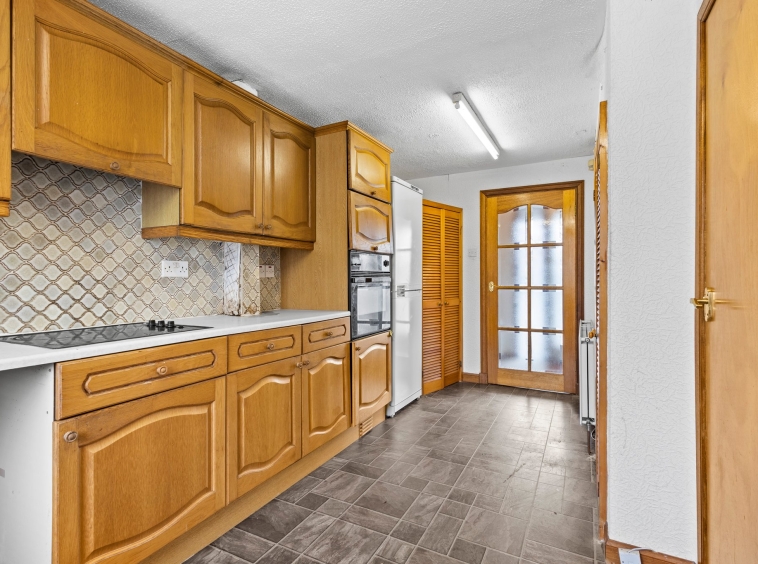 3.07m x 5.23m (10′ 1″ x 17′ 2″) Fitted kitchen offering an array of wall and base units, complementary worksurfaces, integrated electric hob and oven, plumbing space for washing machine and fridge freezer, stainless steel sink and drainer, vinyl flooring, two storage cupboards and double glazed window to the rear.