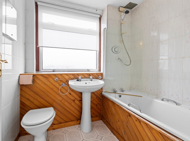 1.99m x 1.73m (6′ 6″ x 5′ 8″) Three piece bathroom featuring WC, wash hand basin, mains shower over bath, tiled walls and floor and double glazed opaque window to the rear.