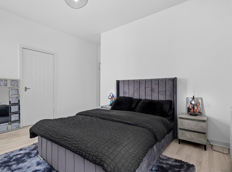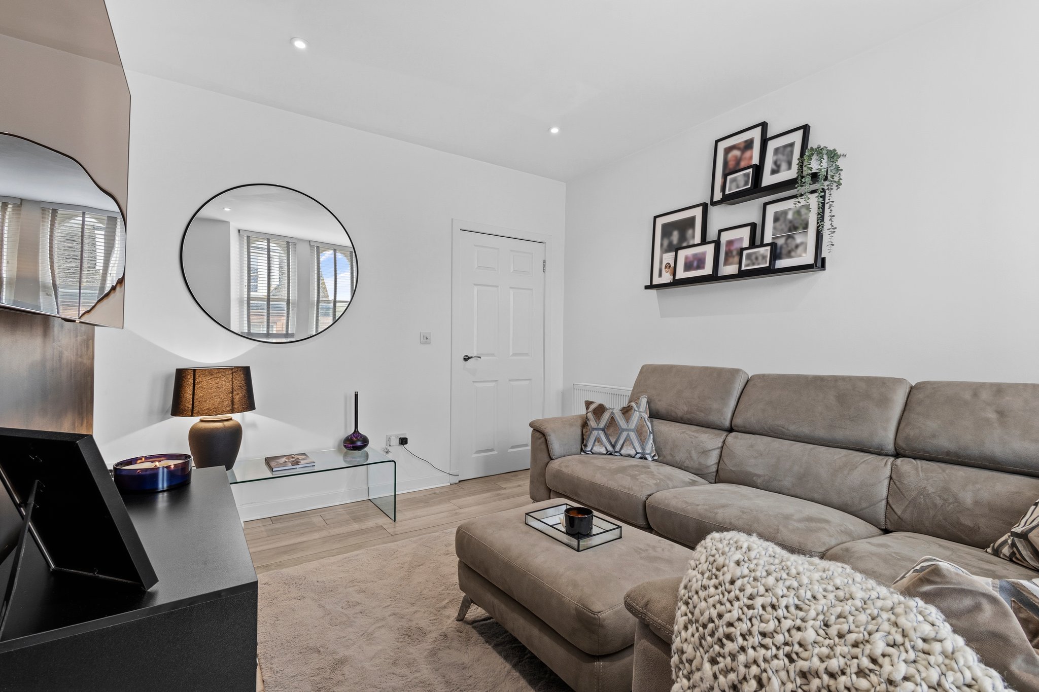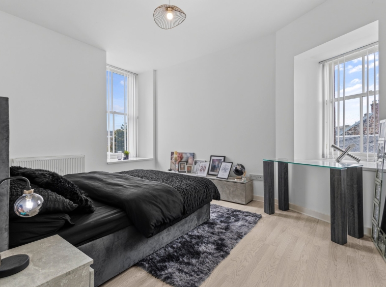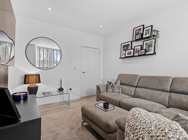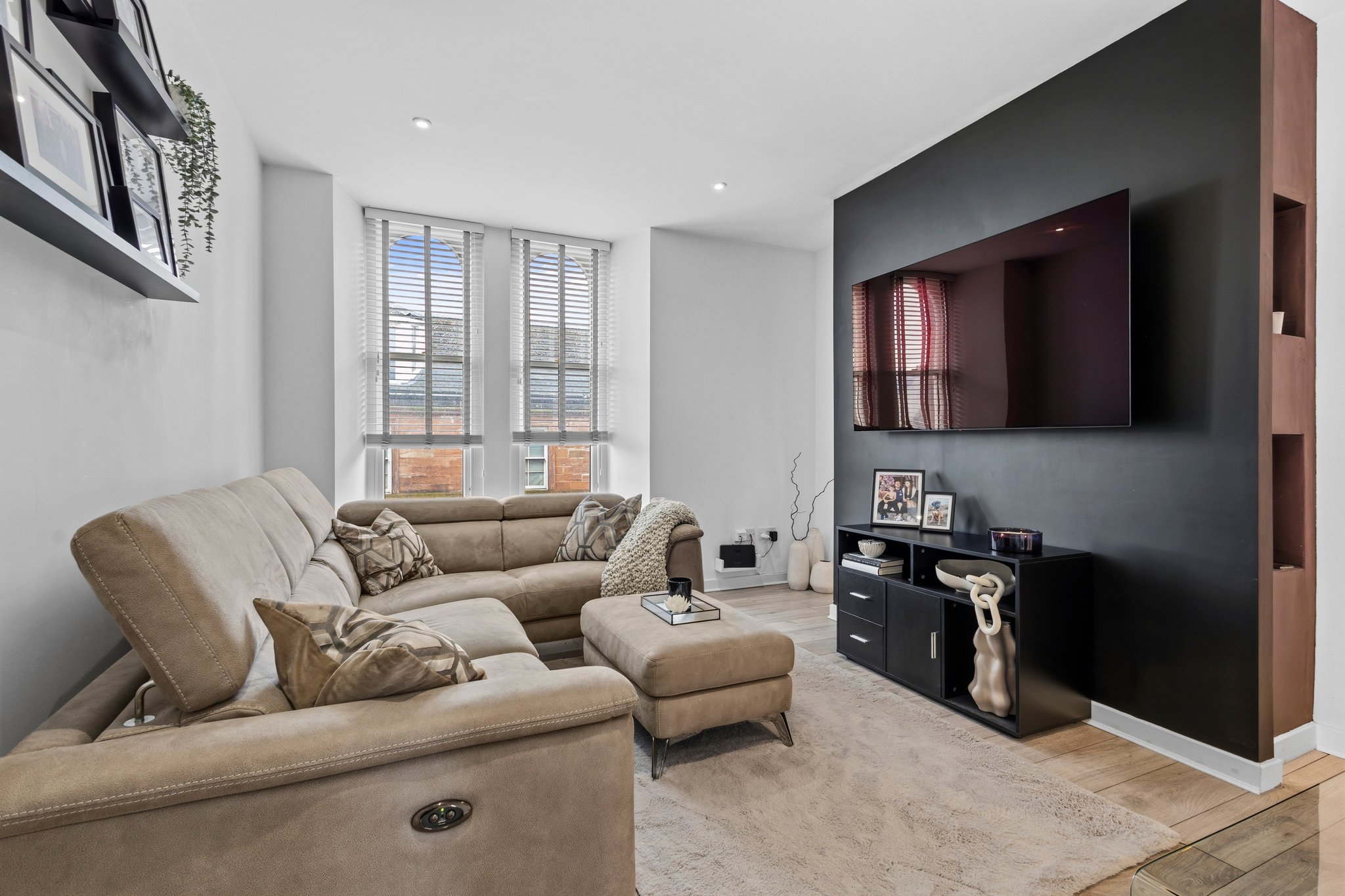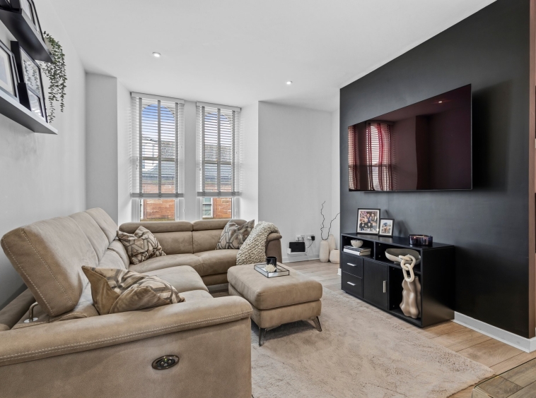 3.69m x 4.41m (12′ 1″ x 14′ 6″) Generous main apartment featuring crisp white decor, standout feature media wall, ceiling spotlights, laminate flooring and two traditional high double glazed windows to the front.