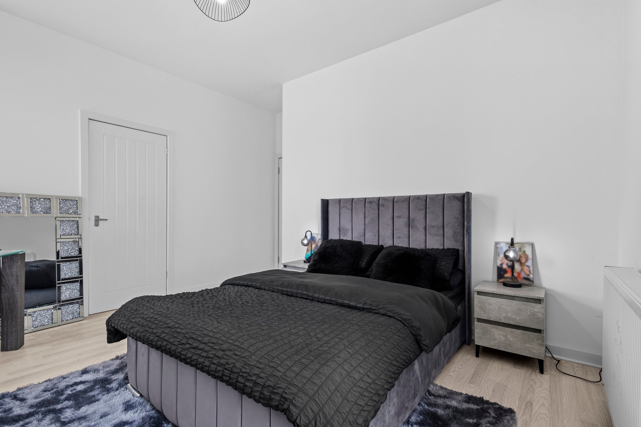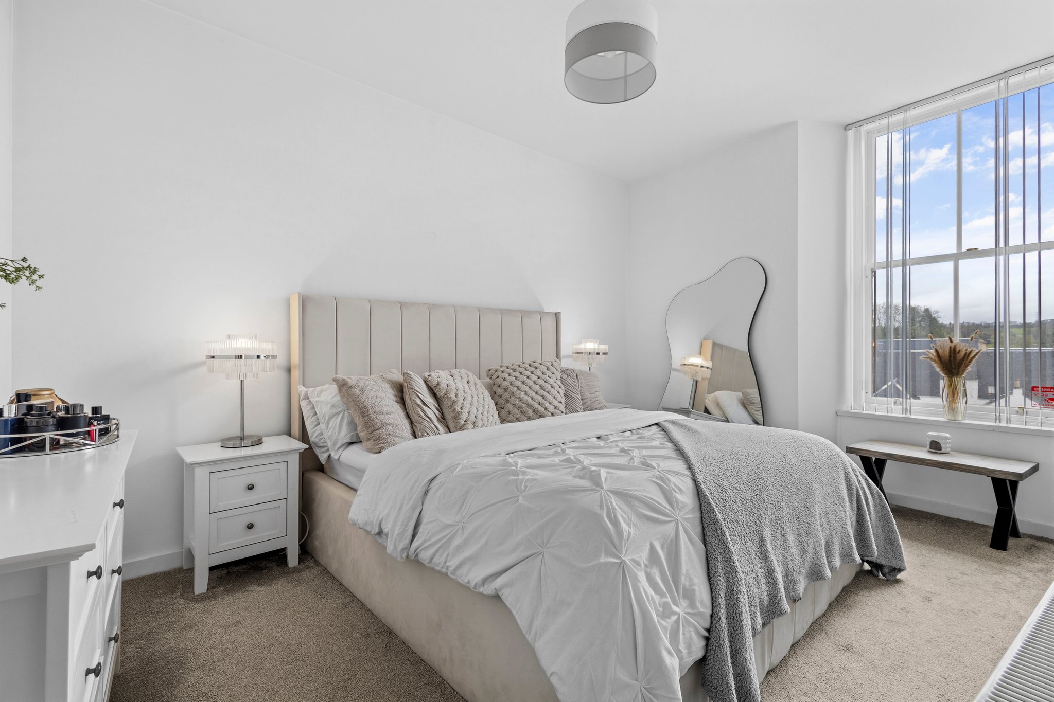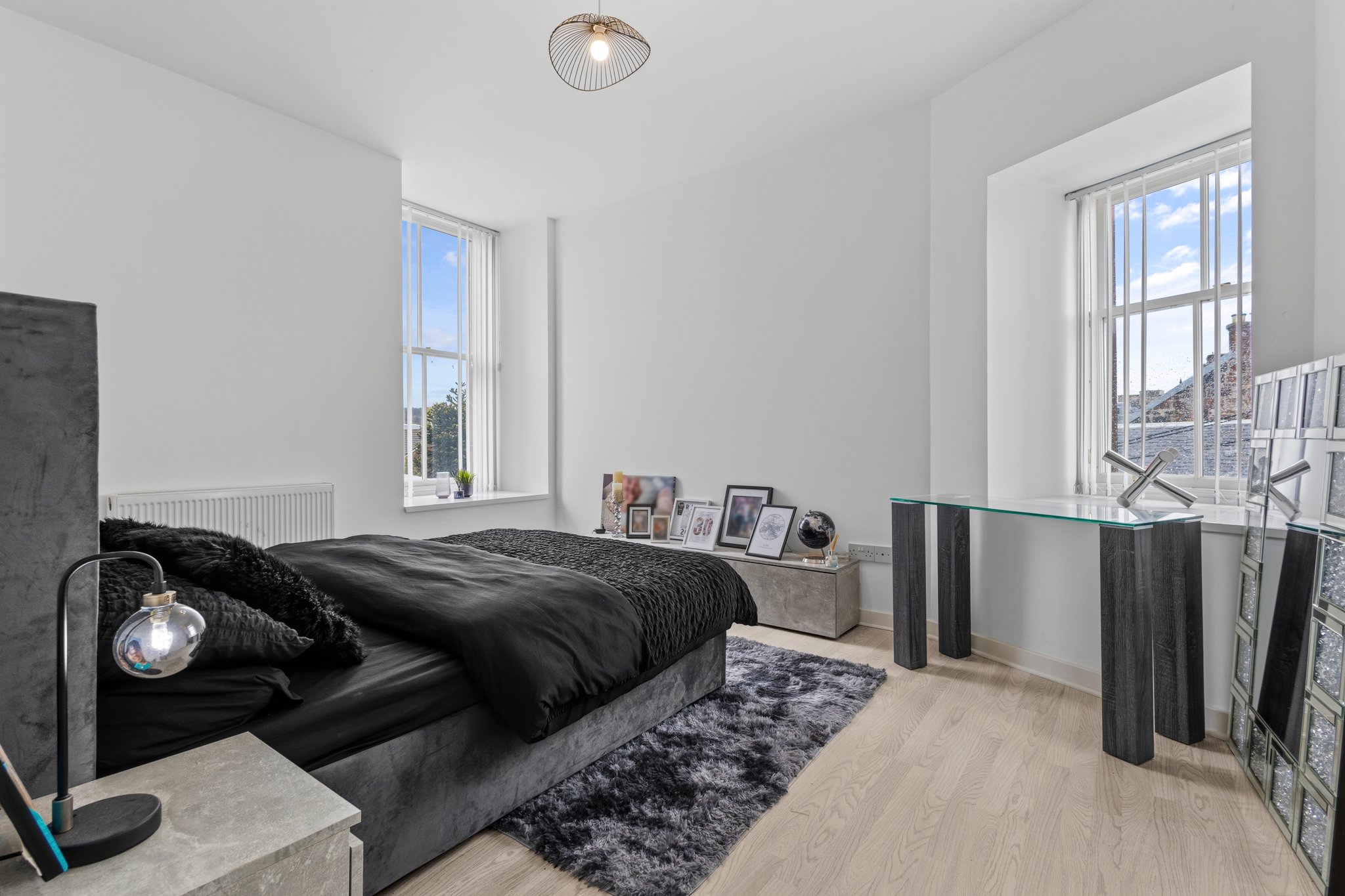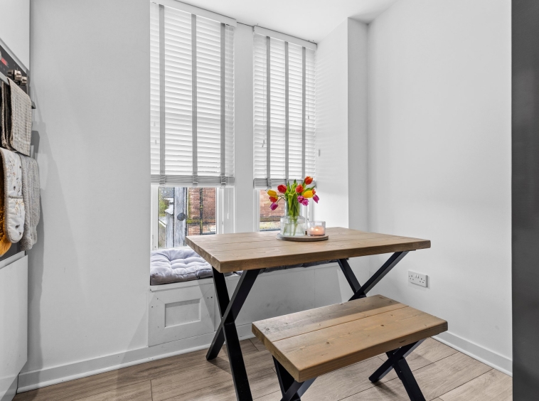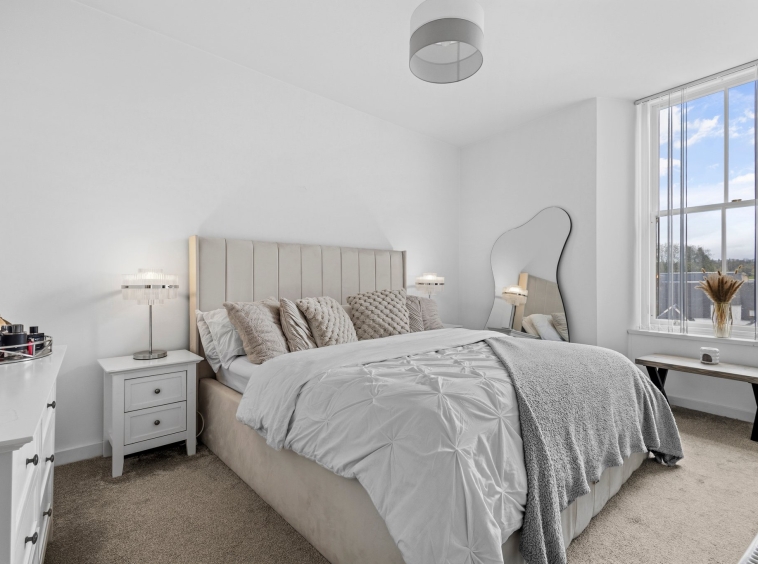 3.69m x 4.41m (12′ 1″ x 14′ 6″) Generous main apartment featuring crisp white decor, standout feature media wall, ceiling spotlights, laminate flooring and two traditional high double glazed windows to the front.