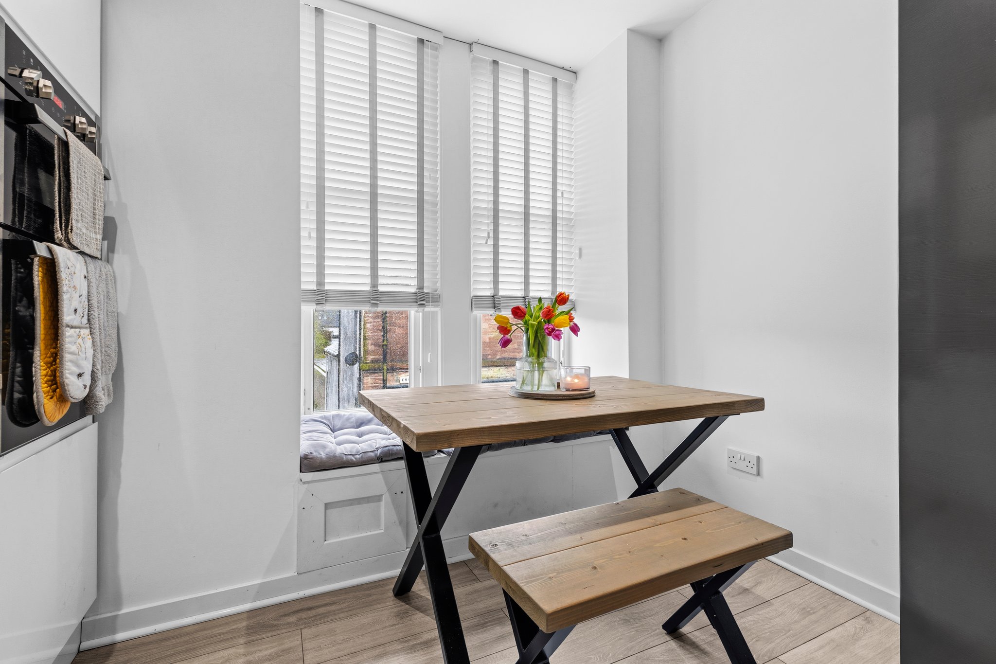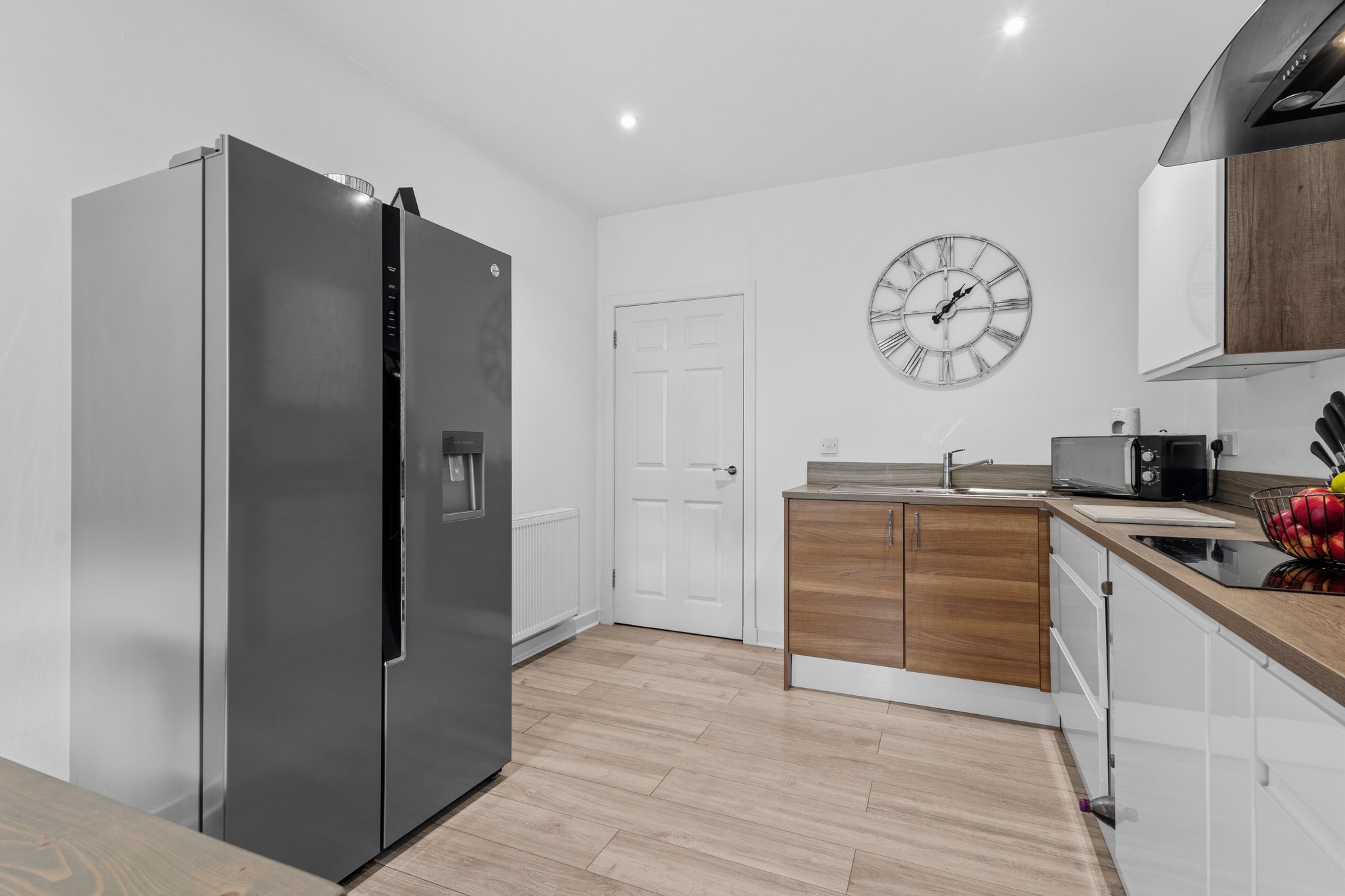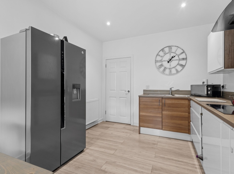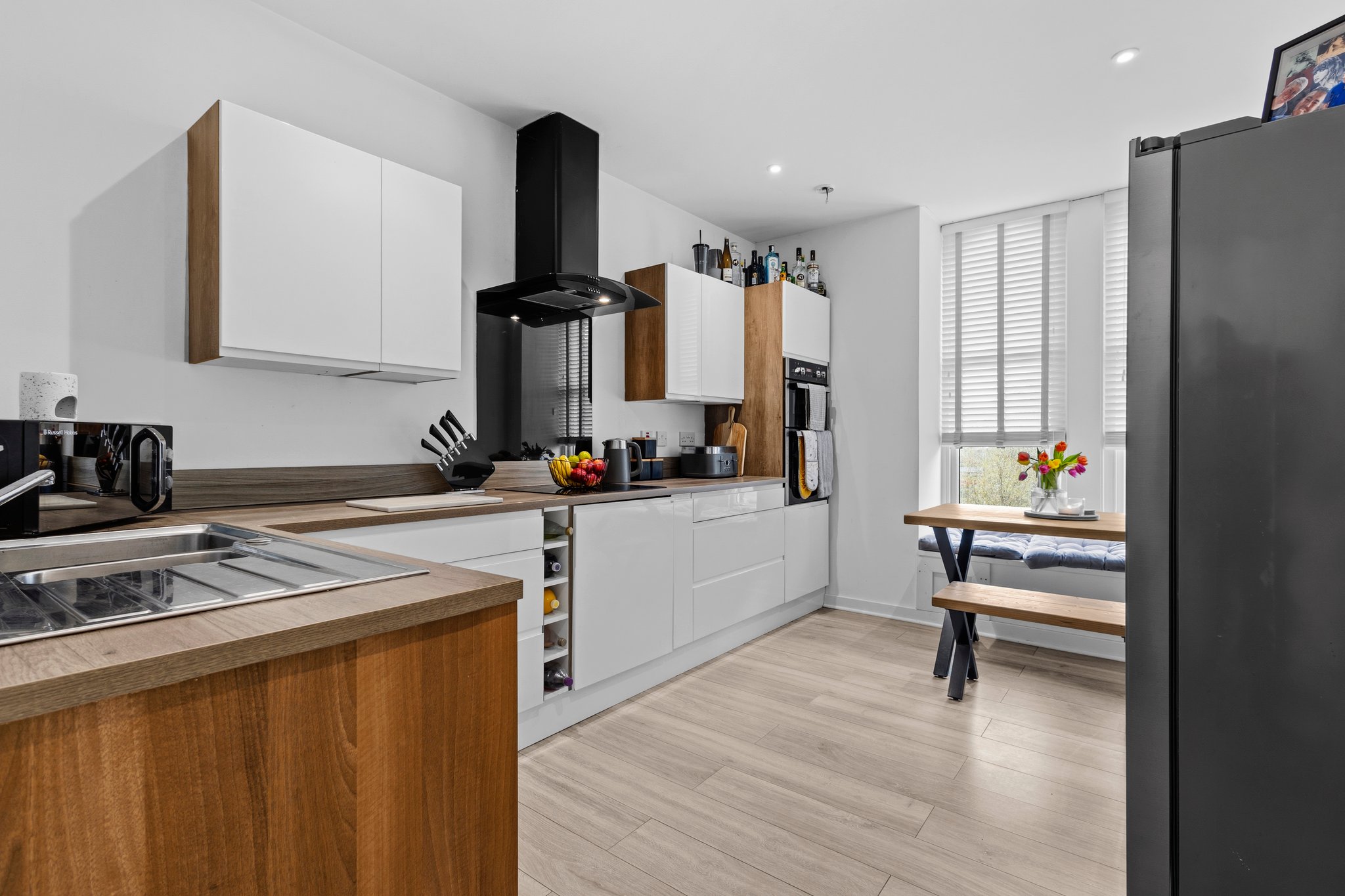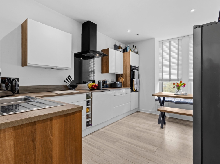 2.99m x 3.99m (9′ 10″ x 13′ 1″) Fully fitted modern kitchen offering an array of white gloss wall and base units, contrasting oak effect work surfaces, integrated induction hob with anthracite splashback and matching cooker hood, integrated double oven, stainless steel sink and drainer, space for freestanding American fridge freezer, space for dining table and chairs with the bay window providing seating, crisp white decor, ceiling spotlights, laminate flooring and two traditional double glazed windows to the front.