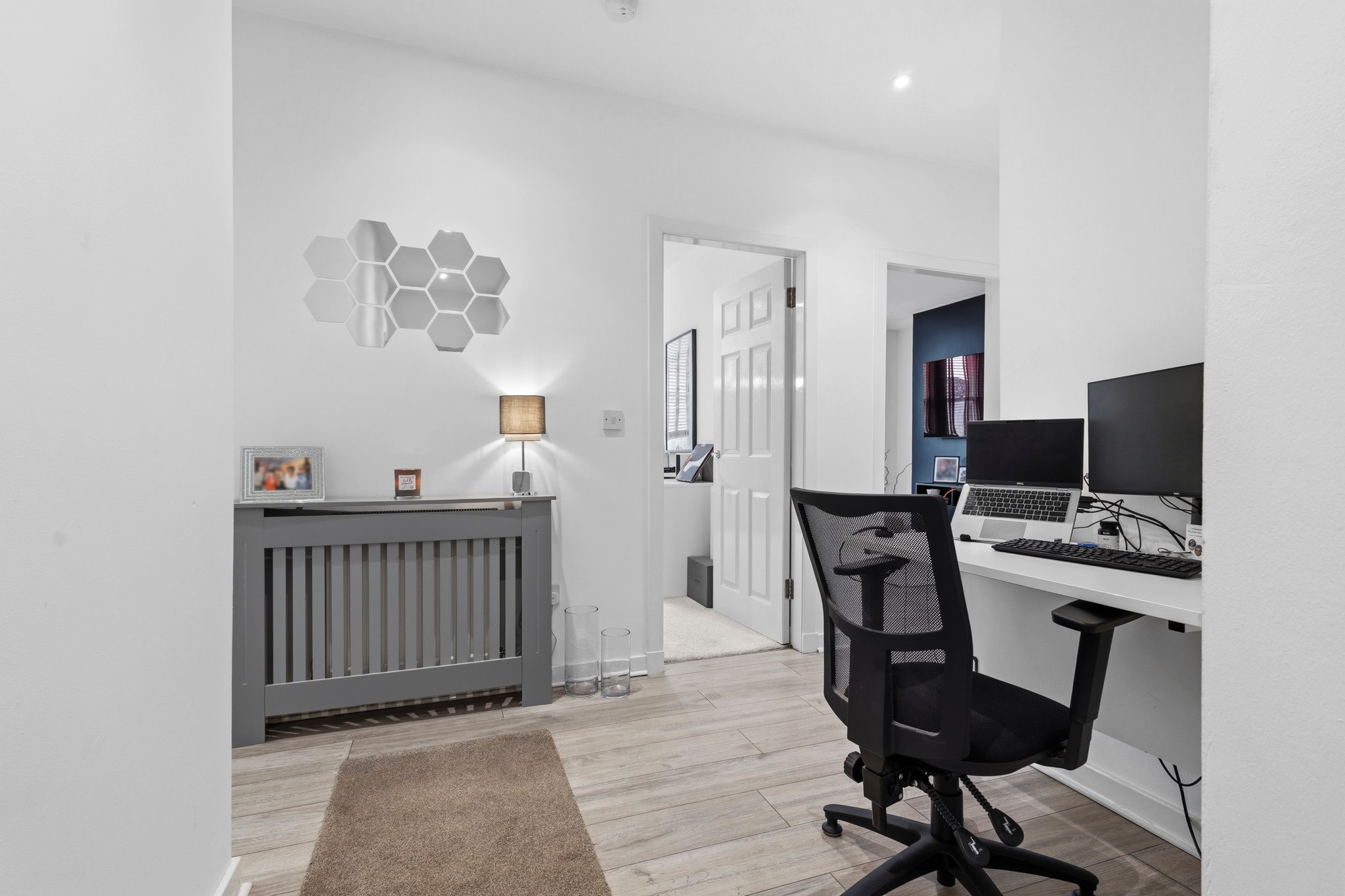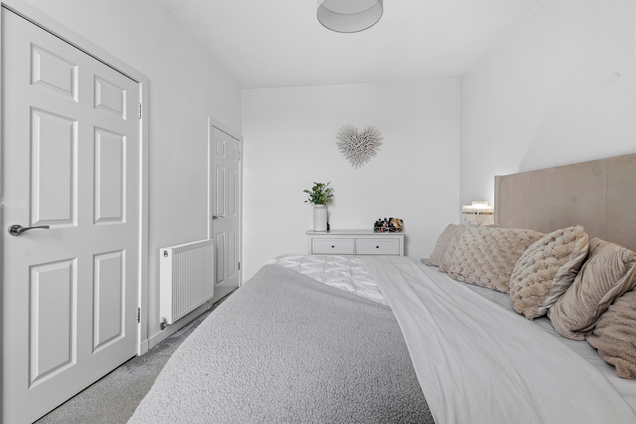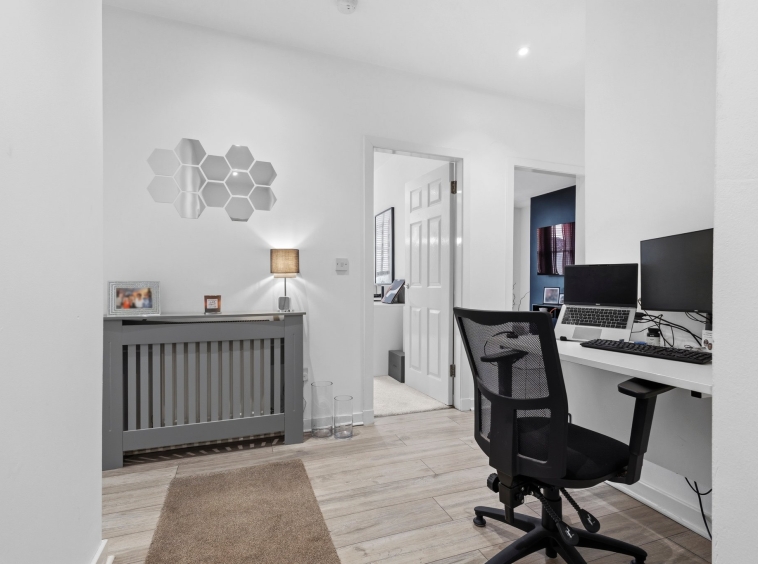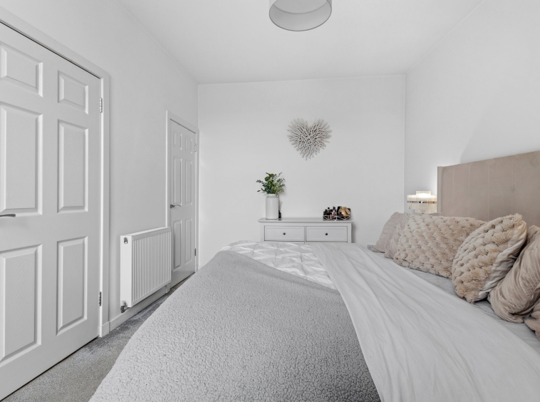 3.27m x 4.08m (10′ 9″ x 13′ 5″) A second double bedroom featuring crisp white decor, laminate flooring, two traditional double glazed windows to the side and rear and gives access to storage room.