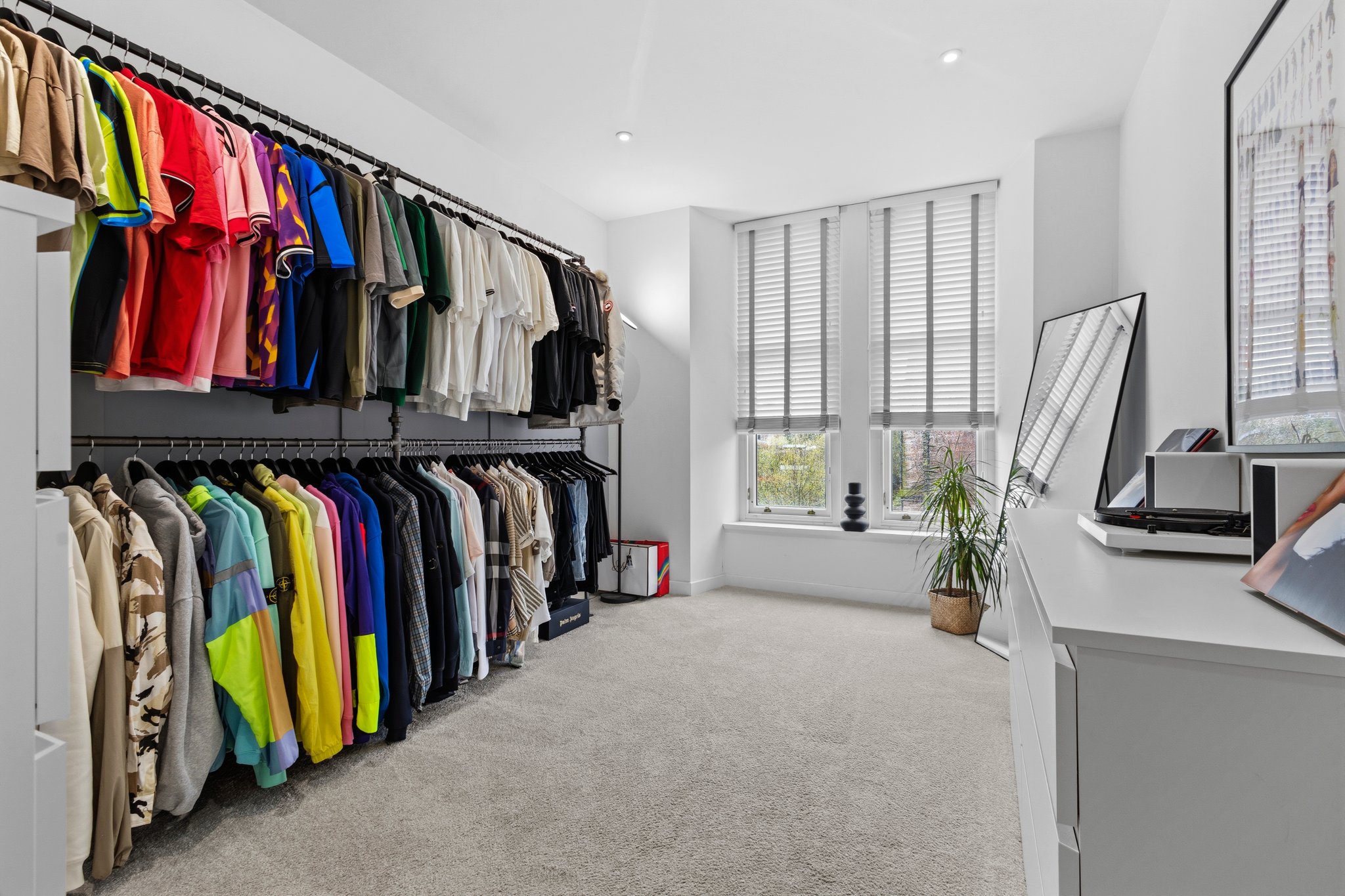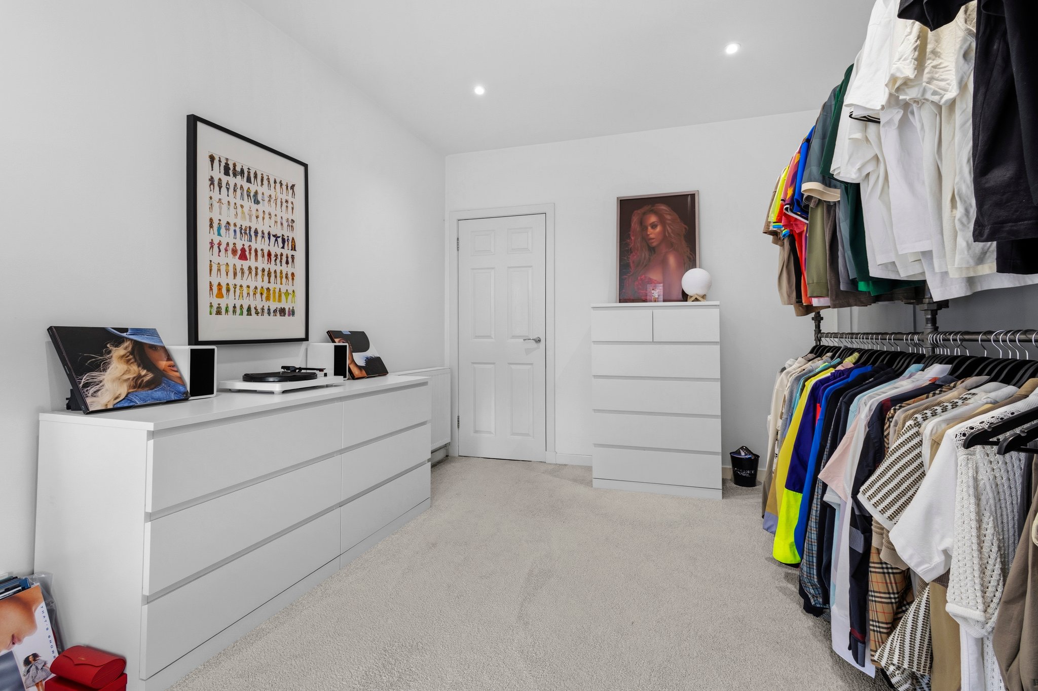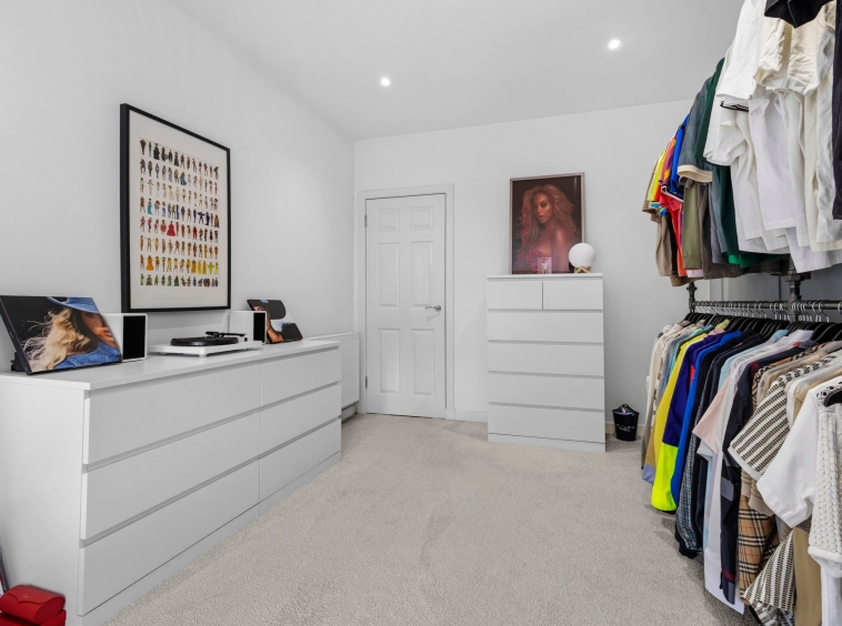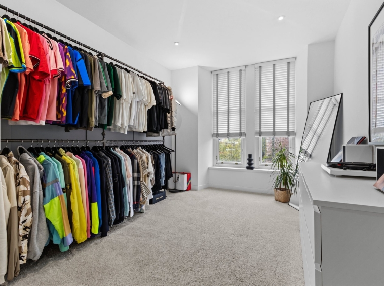 2.91m x 4.41m (9′ 7″ x 14′ 6″) Third double bedroom currently utilised as a dressing room features crisp white decor, ceiling spotlights, fitted carpet and two double glazed traditional windows to the front.