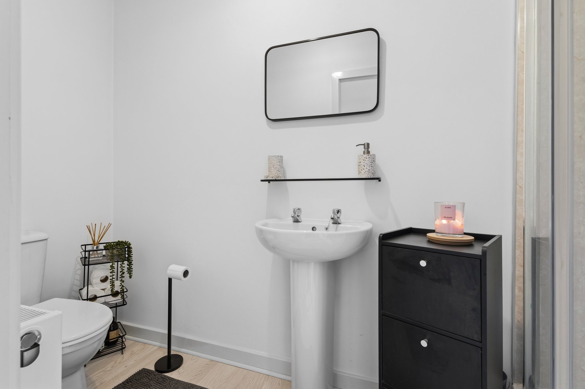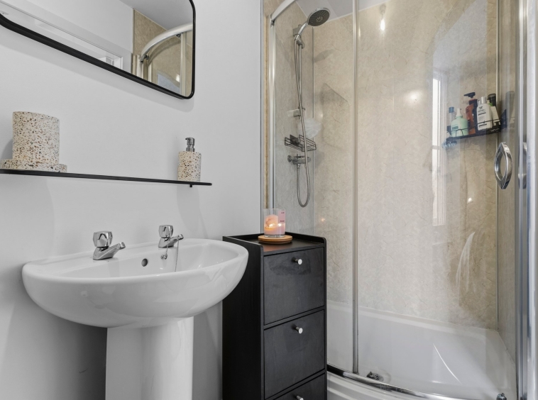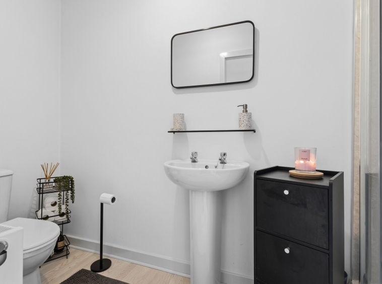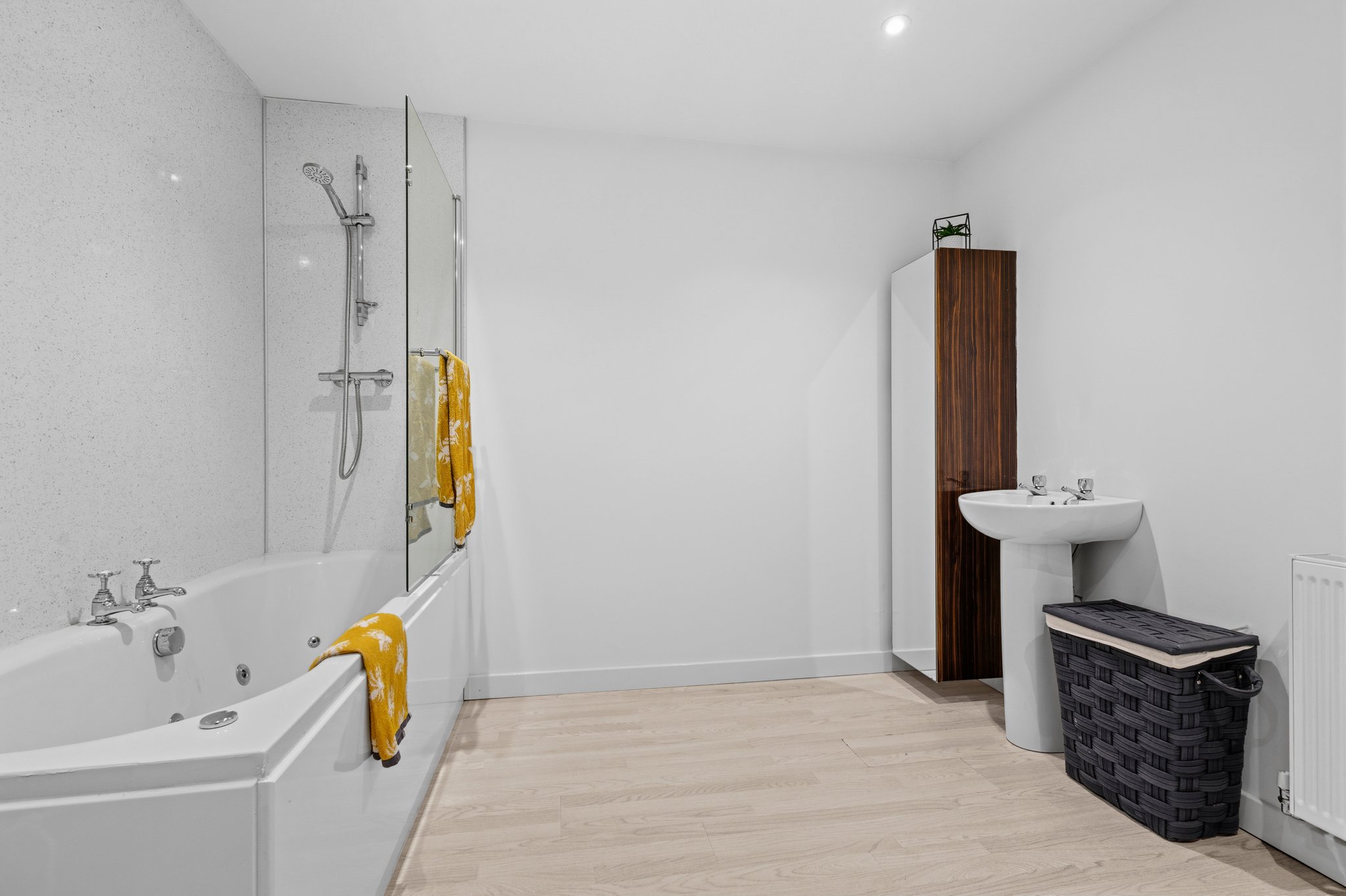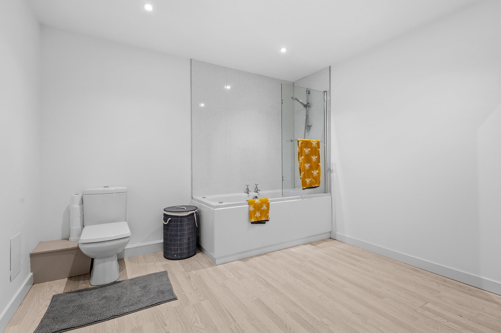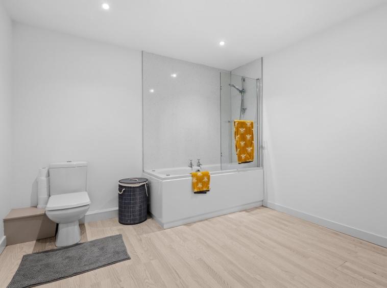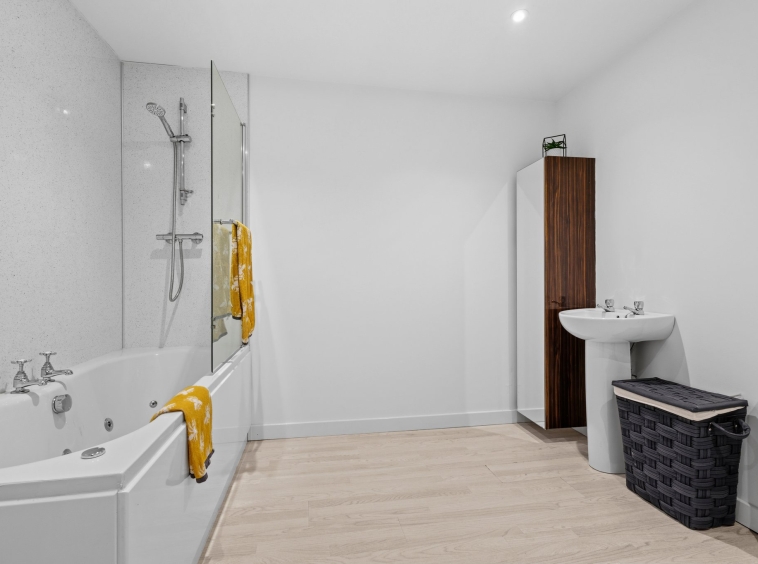 2.91m x 3.09m (9′ 7″ x 10′ 2″) Spacious main bathroom comprising WC, wash hand basin, mains shower over bath, vanity storage, crisp white decor, ceiling spotlights and laminate flooring.