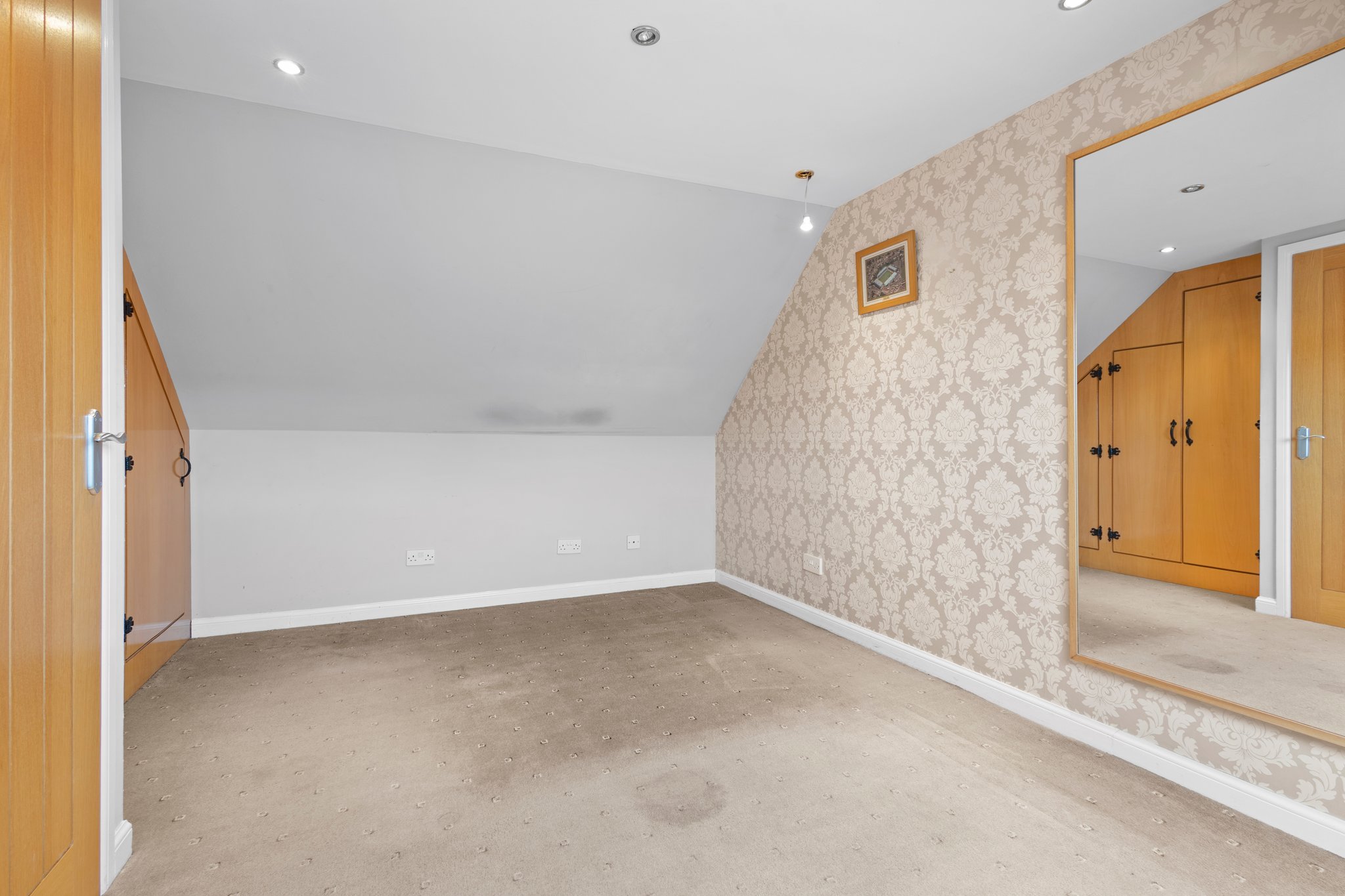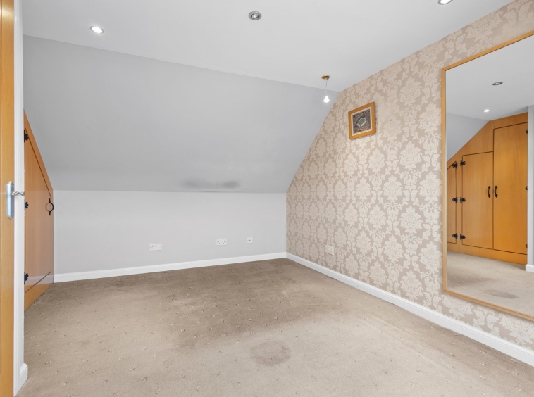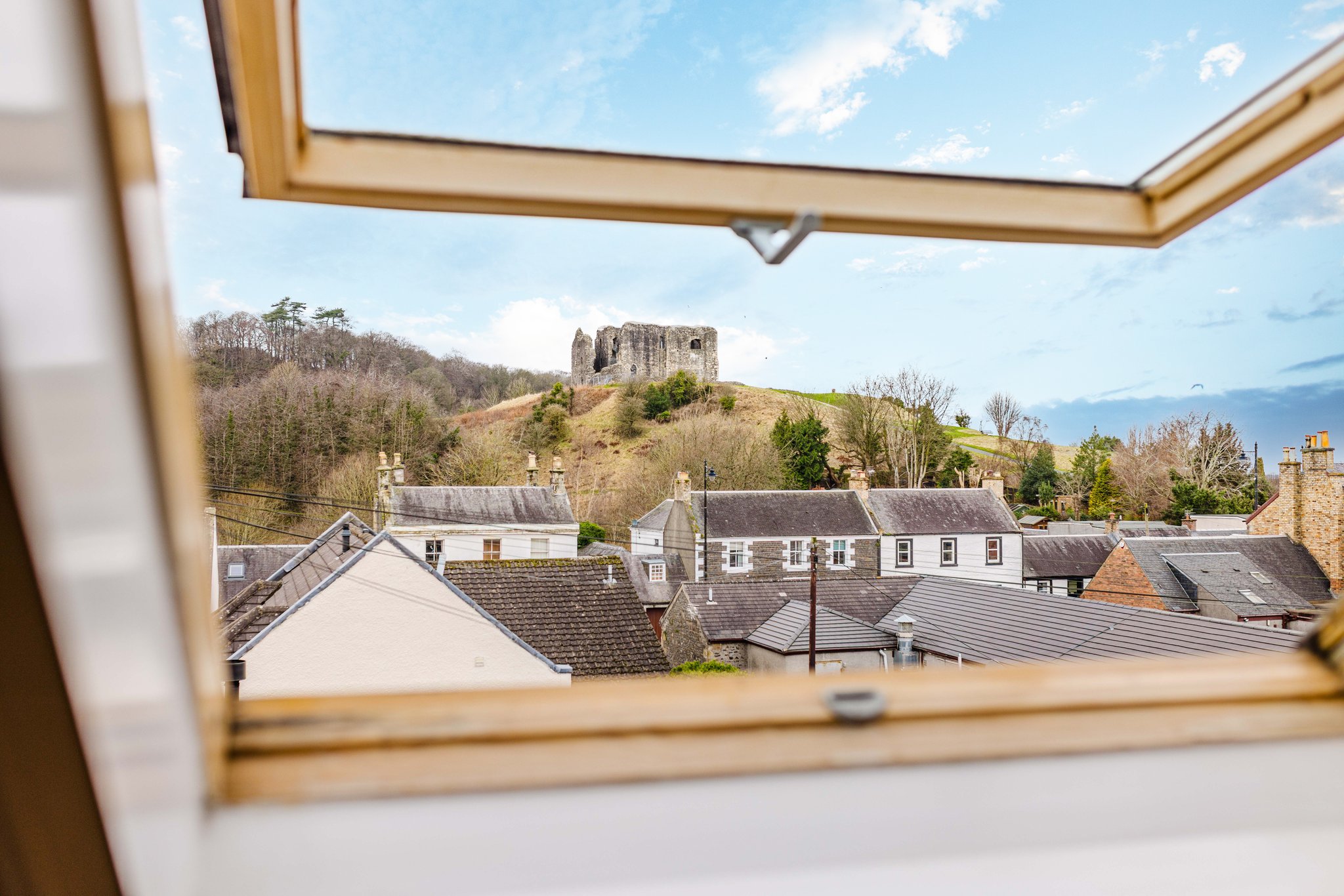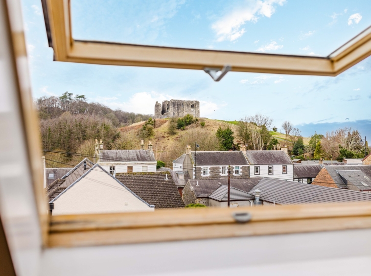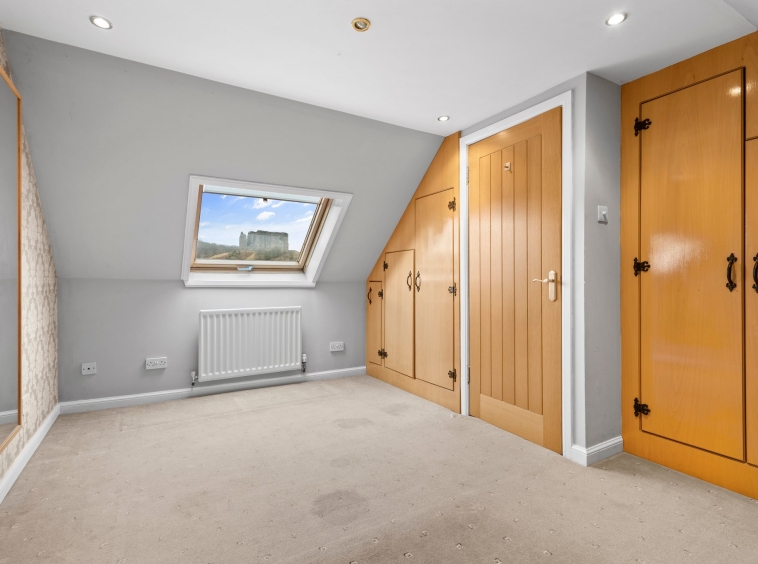 4.35m x 3.02m (14′ 3″ x 9′ 11″) Located on the top floor, the master bedroom is an impressive double offering neutral decor, fitted carpet and fitted wardrobes providing storage space. Double glazed Velux window to the rear boasting excellent views of the historic castle.