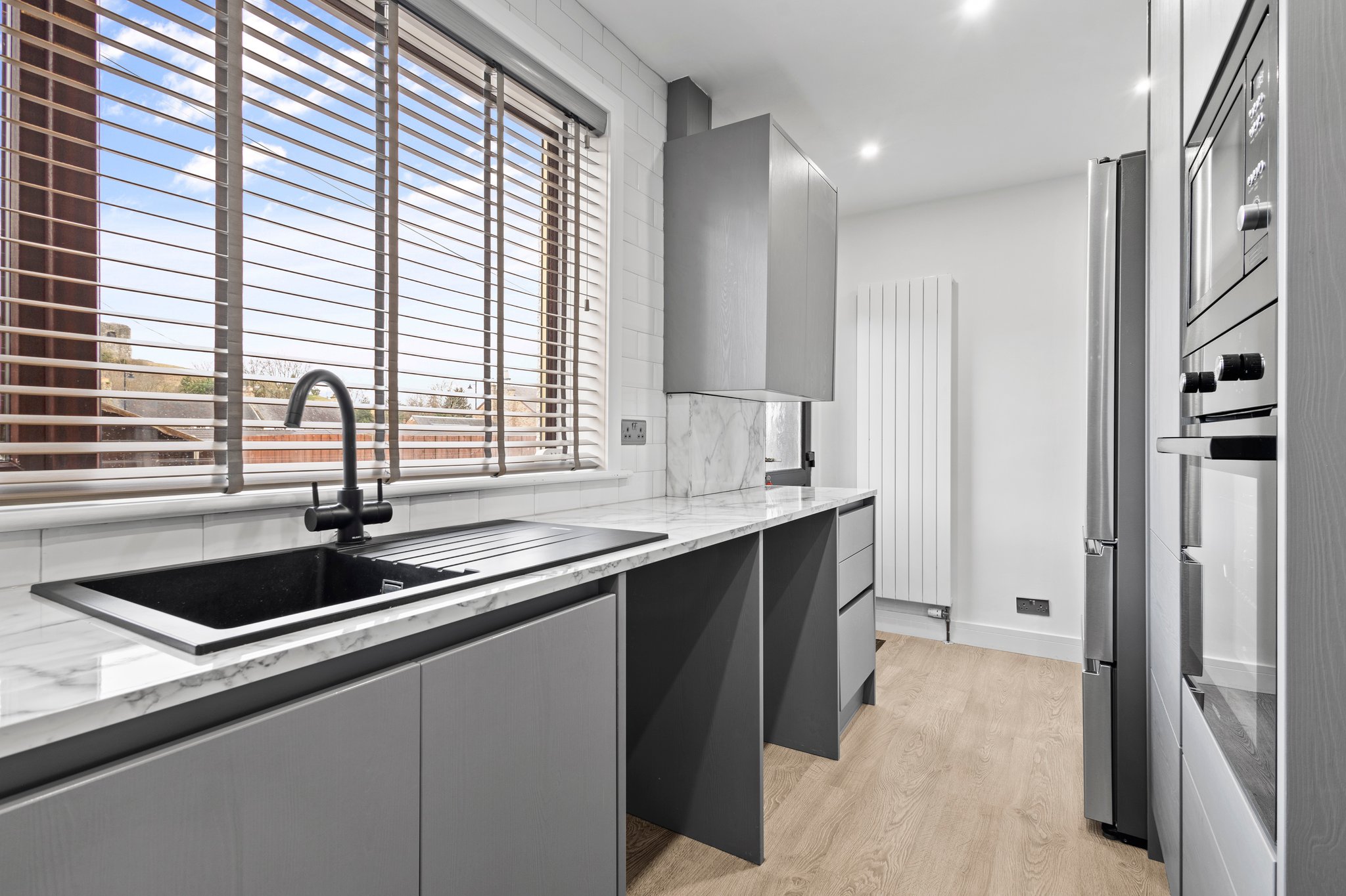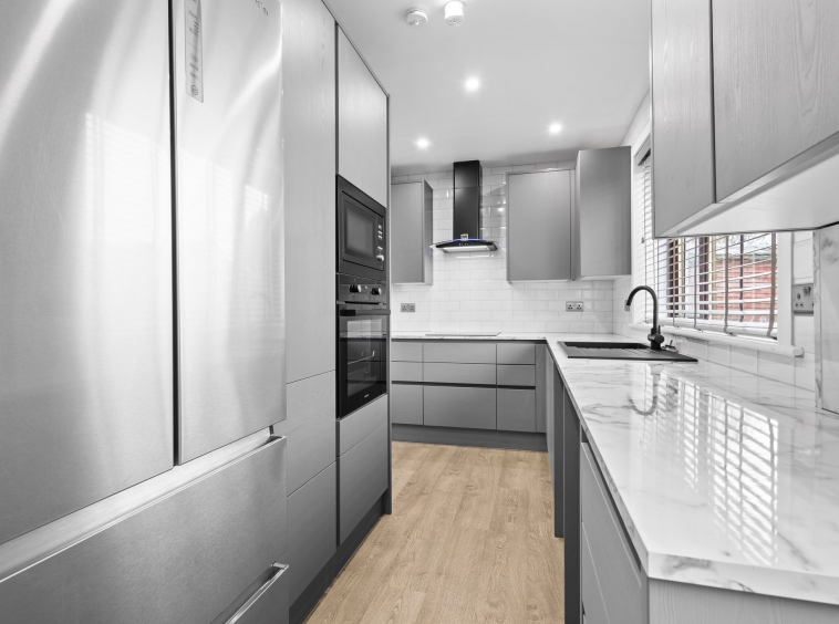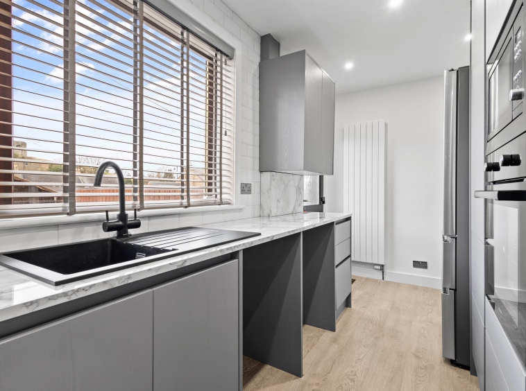 4.63m x 2.11m (15′ 2″ x 6′ 11″) Stylish fully fitted kitchen offering a range of modern grey handle less wall and base storage units with complementary work surfaces, composite sink and drainer, integrated oven, electric hob and microwave. Plumbing/space for washing machine and tumble dryer, neutral decor, laminate flooring, ceiling spotlights, double glazed window to the rear and door leading out into the rear gardens. Door to wet room.