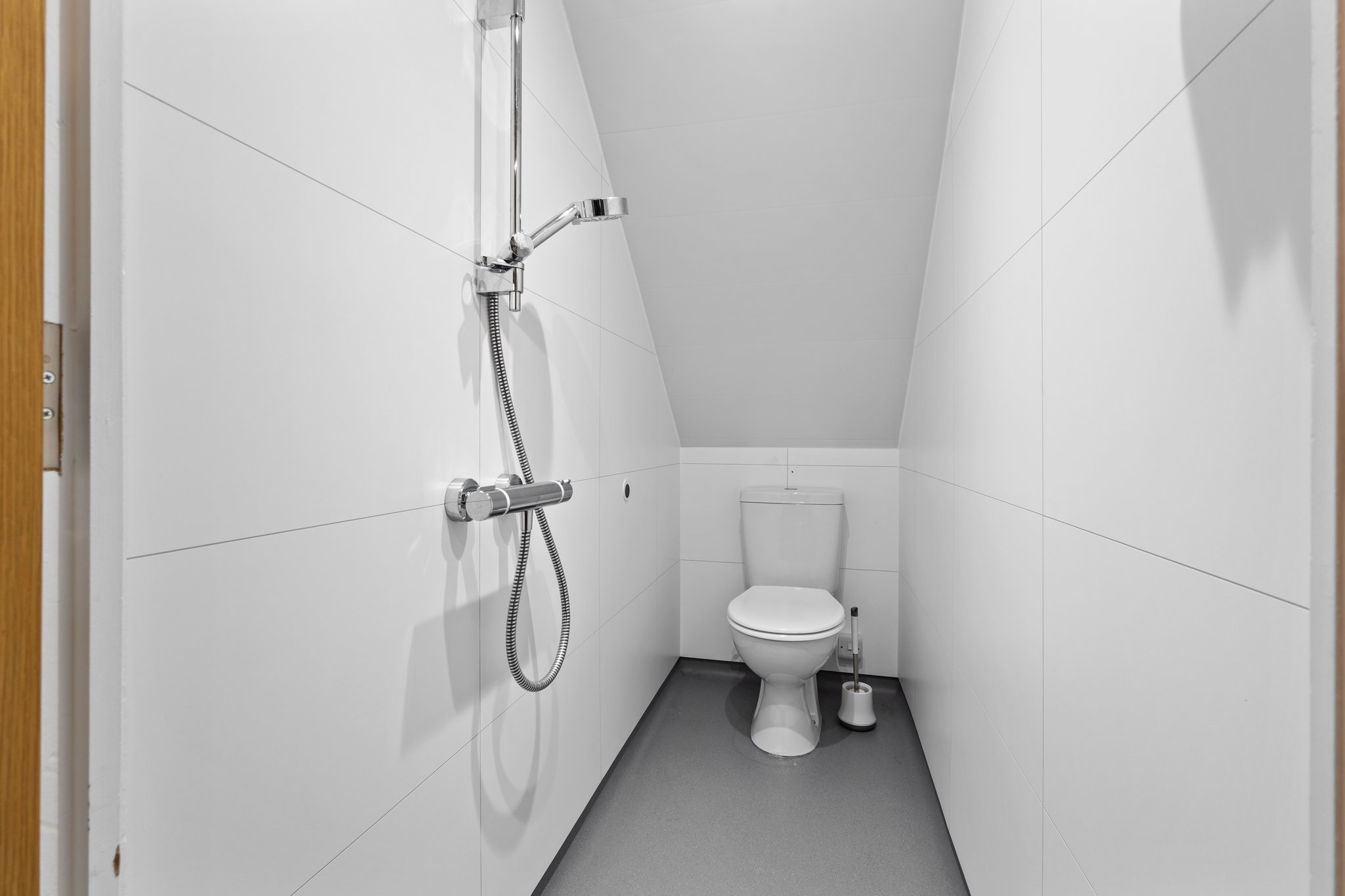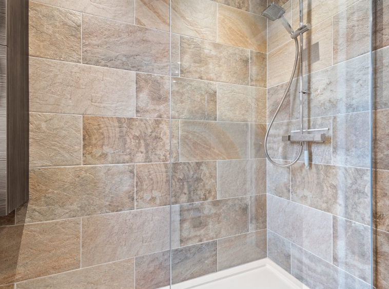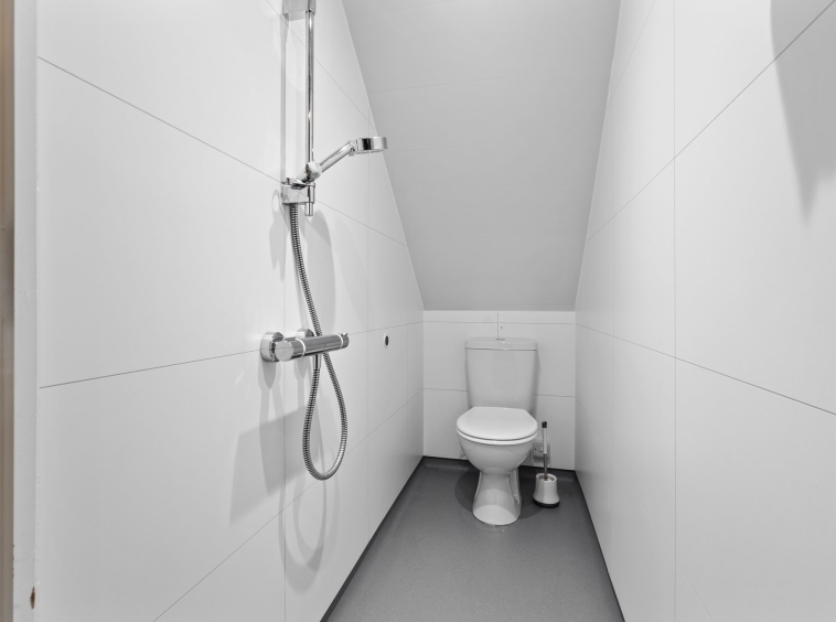 2.07m x 0.87m (6′ 9″ x 2′ 10″) Practical two piece wet room comprising of a wc and mains overhead shower.