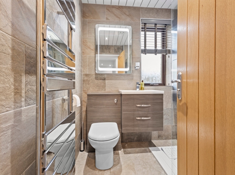 2.11m x 1.98m (6′ 11″ x 6′ 6″) Completing the accommodation is the modern, upgraded three piece shower room comprising of a wash hand basin with vanity storage, wc and shower cubicle with mains overhead shower. Contemporary fully tiled walls and floor, heated towel rail, LED mirror, ceiling spotlights and a double glazed opaque window to the rear.
