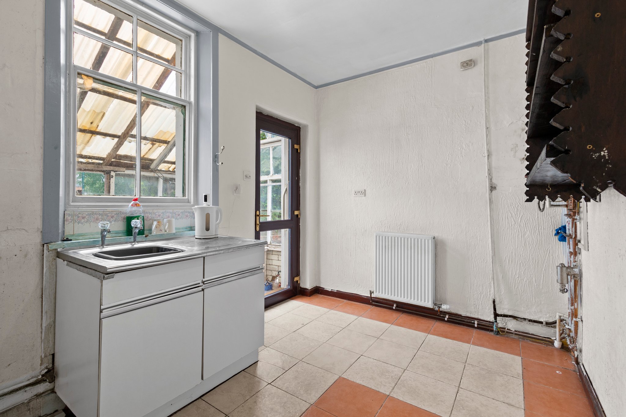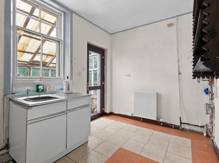 3.58m x 2.58m (11′ 9″ x 8′ 6″) Spacious kitchen with stainless steel sink and drainer, plumbing/space for cooker, washing machine and fridge/freezer. Tiled flooring, neutral decor, door and window to the rear.