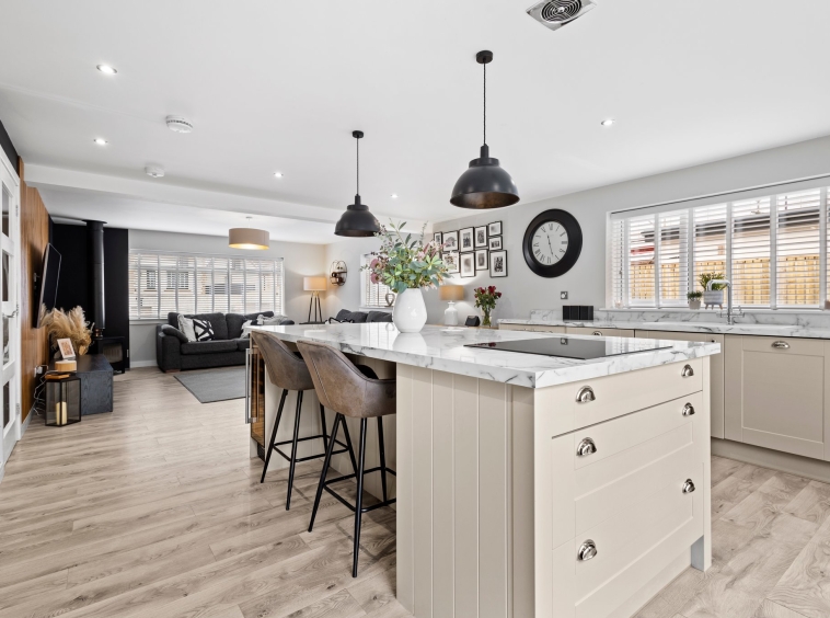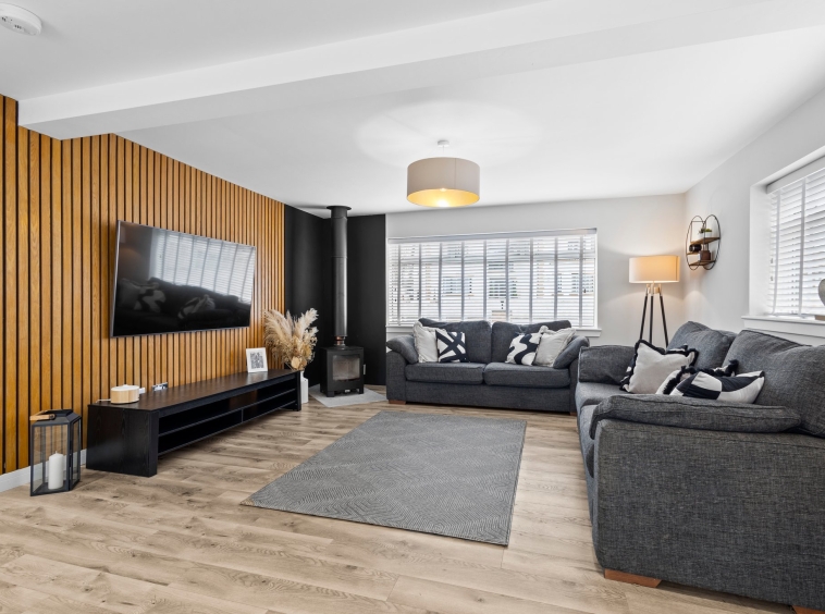 4.51m x 5.43m (14′ 10″ x 17′ 10″)An impressive lounge featuring a modern open plan layout to the kicthen complete with stylish decor, feature wood burner, newly fitted high quality laminate flooring and a double glazed window to the front and side.