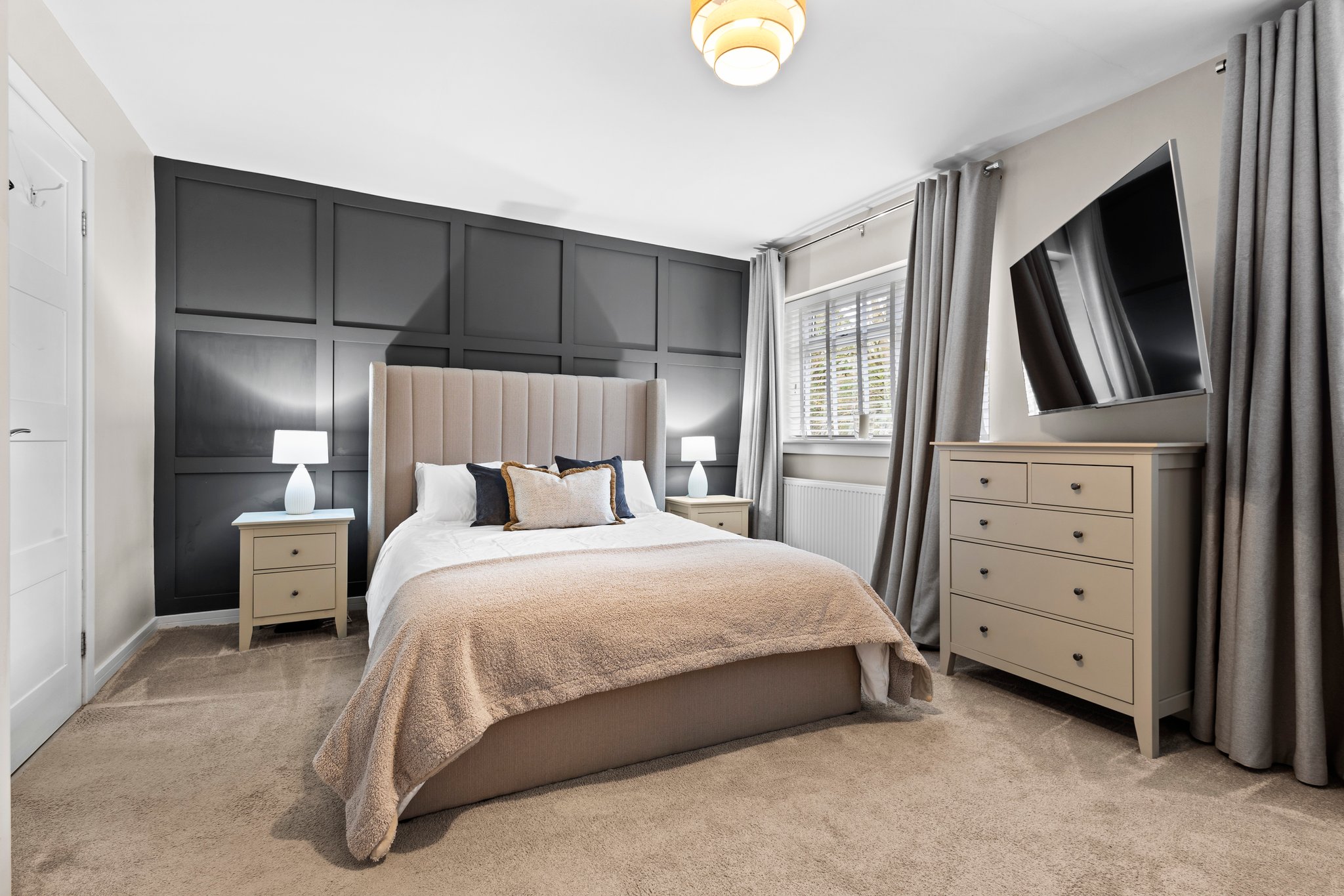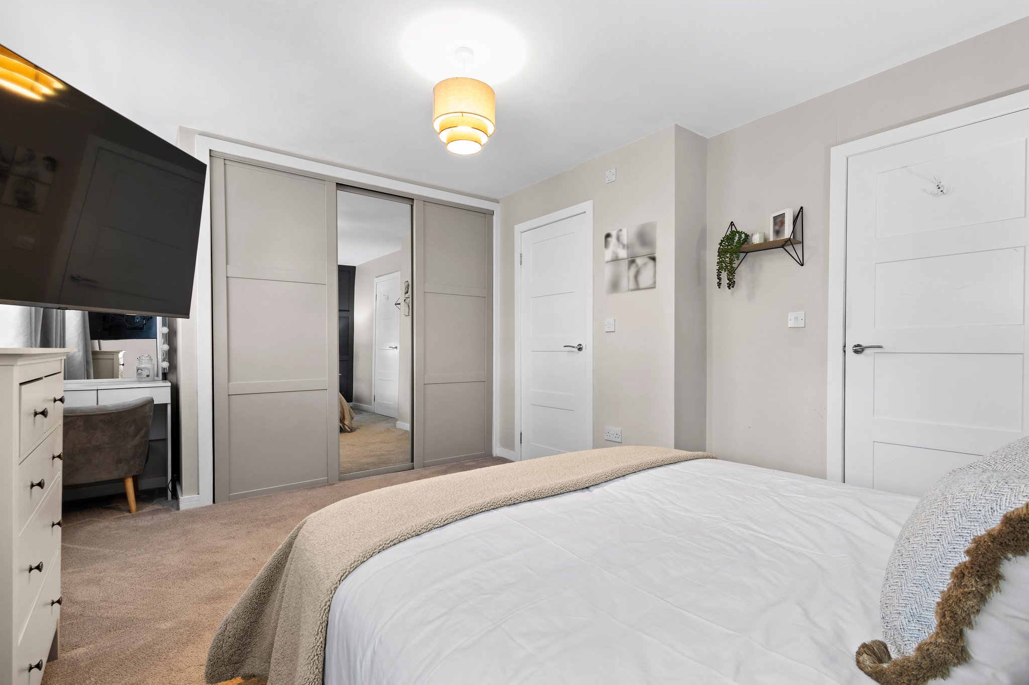 5.11m x 3.52m (16′ 9″ x 11′ 7″) The master bedroom is a generous double offering modern decor with a stylish feature wall, triple fitted wardrobes, fitted carpet, two double glazed windows to the rear and access to the en-suite.