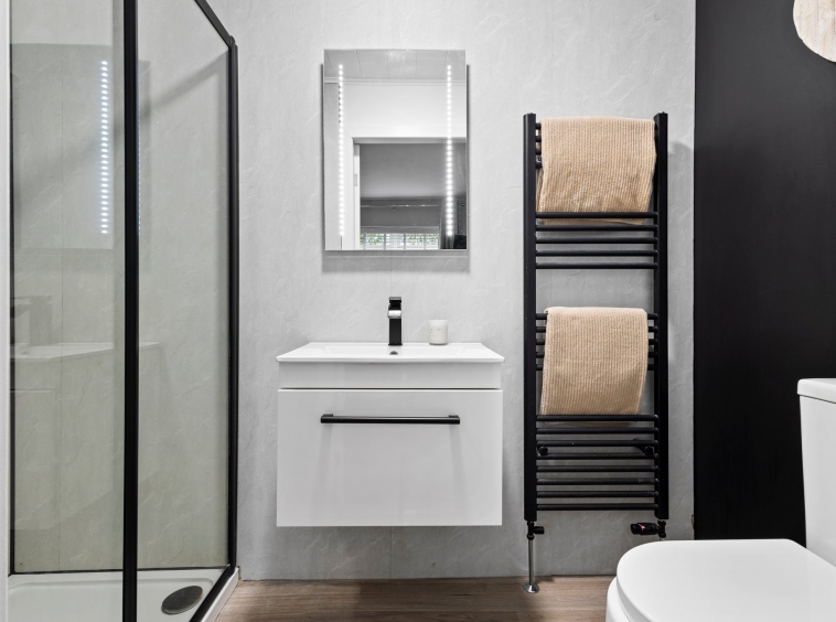 2.51m x 1.19m (8′ 3″ x 3′ 11″) Stylish en-suite comprising of a wash hand basin with vanity storage, shower cubicle with mains shower, heated towel rail, LED mirror, contemporary wet wall finish with stunning black accents and vinyl flooring.