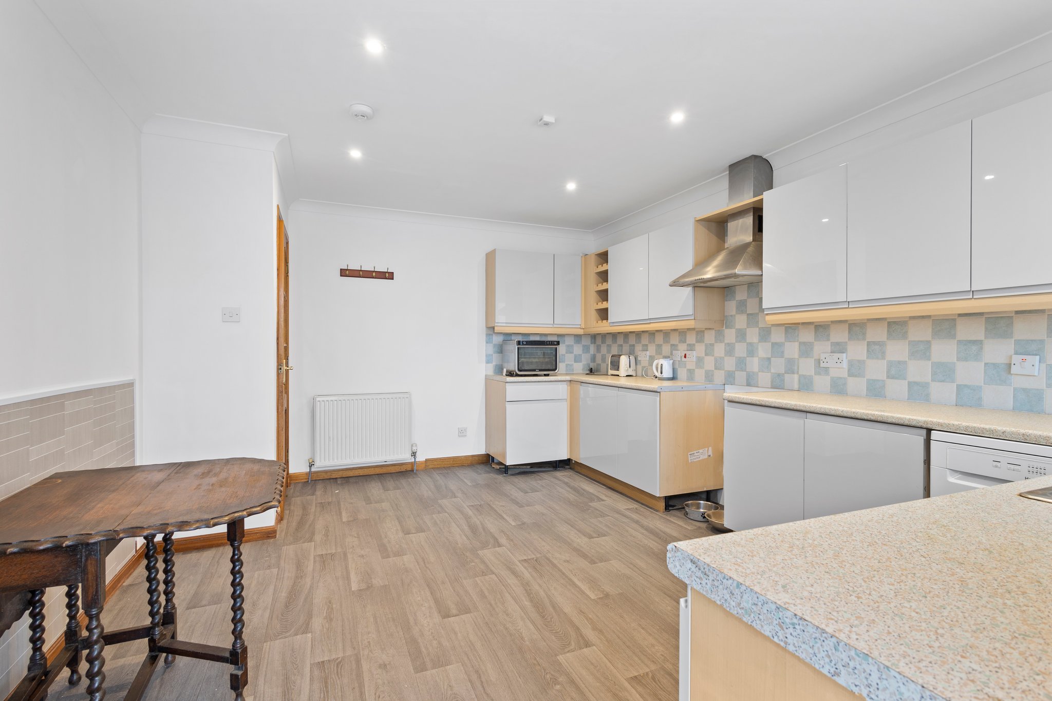 3.56m x 4.80m (11′ 8″ x 15′ 9″) Fully fitted kitchen complete with ample wall and base storage units, complimentary work surface, plumbing and space for a cooker, dish washer and washing machine, stainless steel sink and drainer, neutral decor, dining table and chairs, ceiling spotlights, vinyl flooring, double glazed window to the rear and a door to the conservatory.