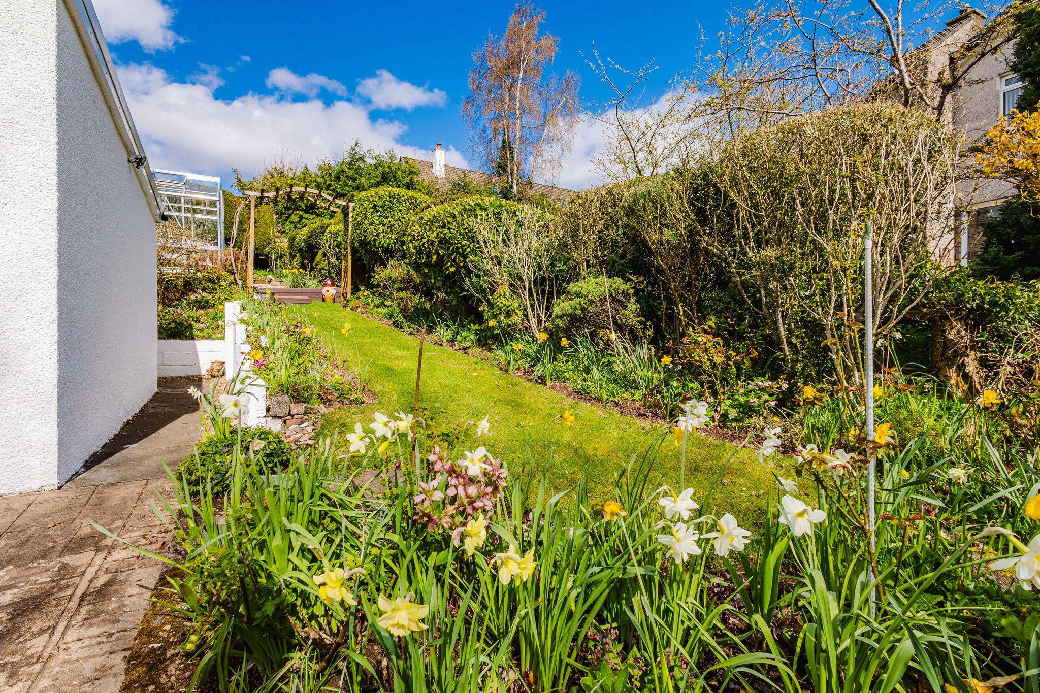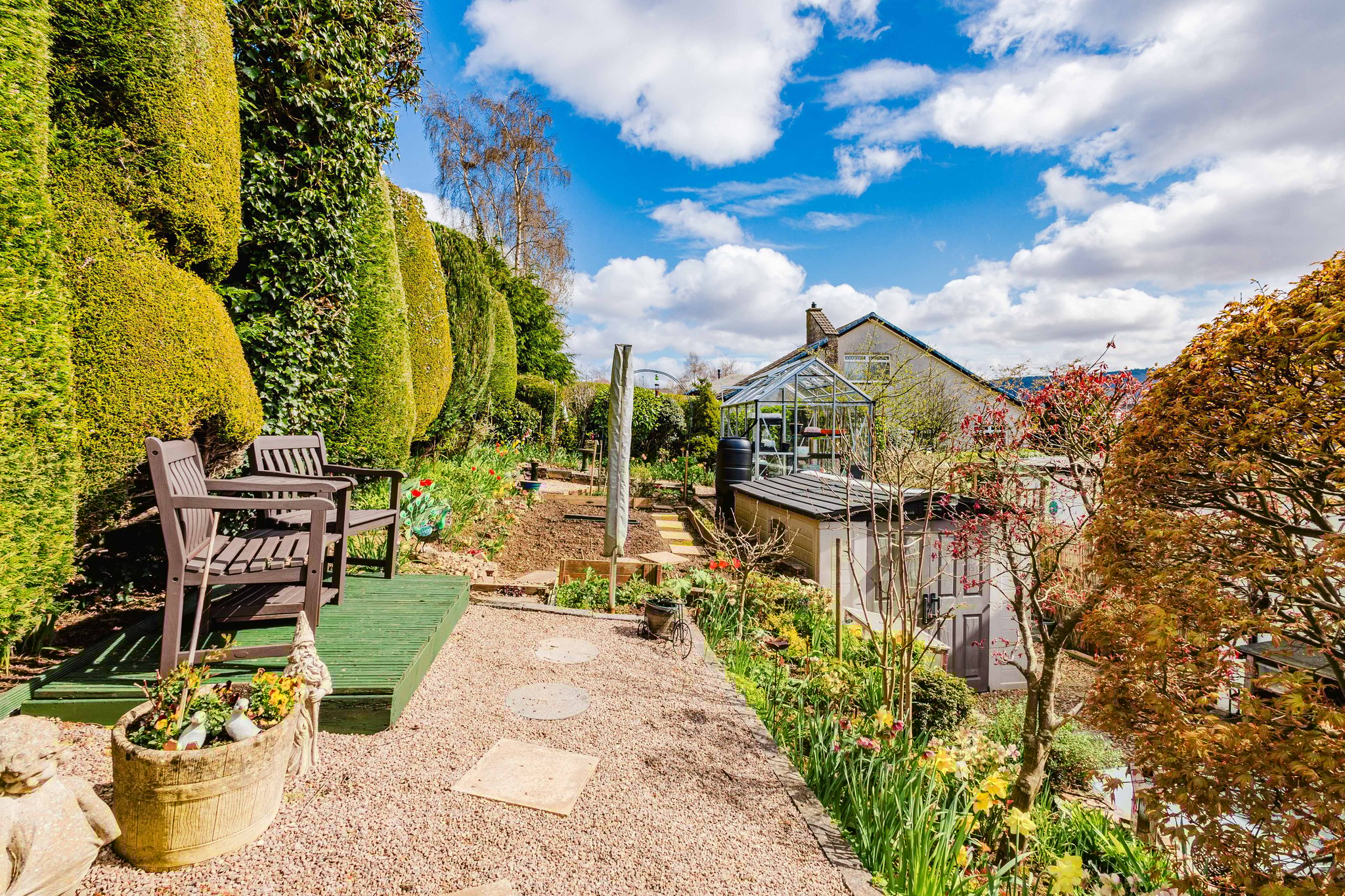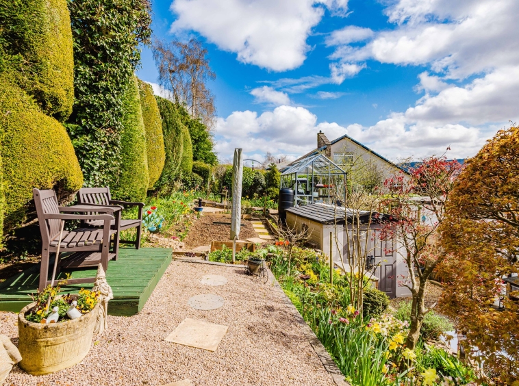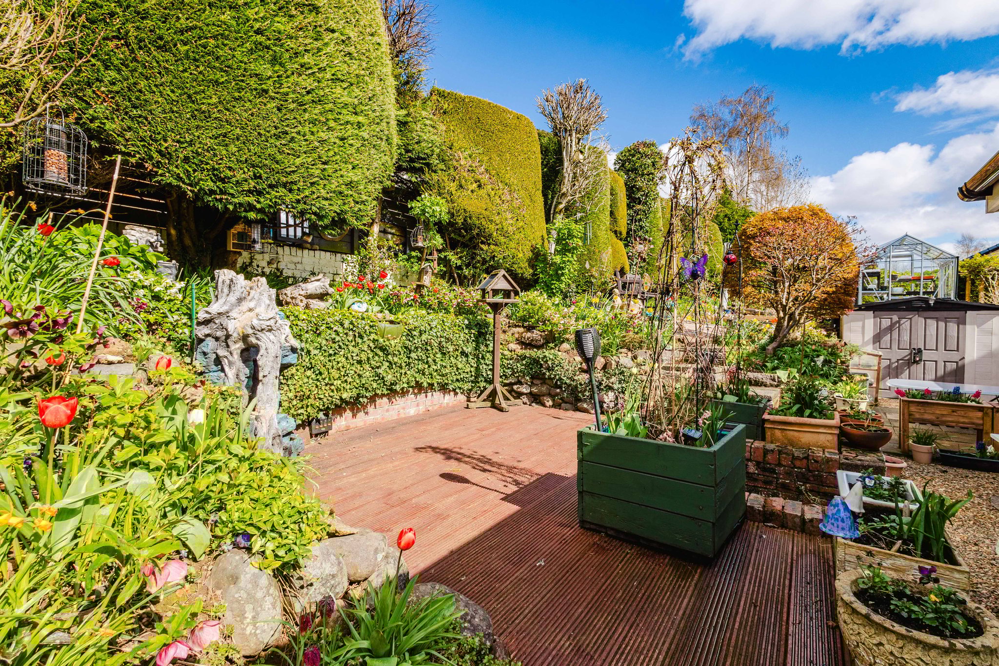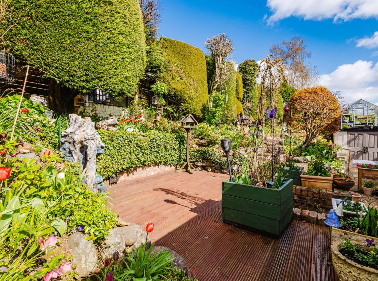 To the rear, the garden opens into a delightful, multi level outdoor space. A raised decking area provides the perfect spot for relaxing or entertaining, surrounded by established planting. Stone edged borders and terraced sections are filled with an array of plants, flowers, and greenery, giving the garden a rich, layered character.
