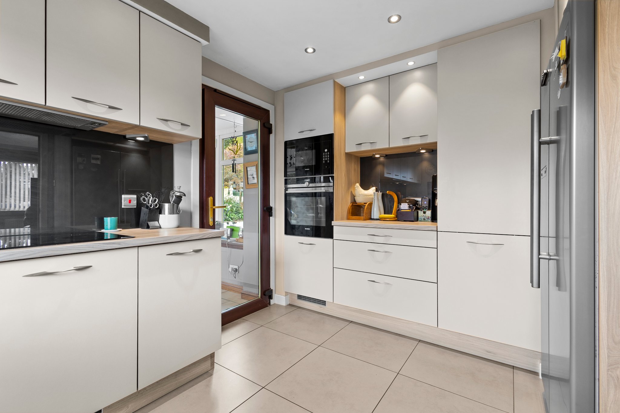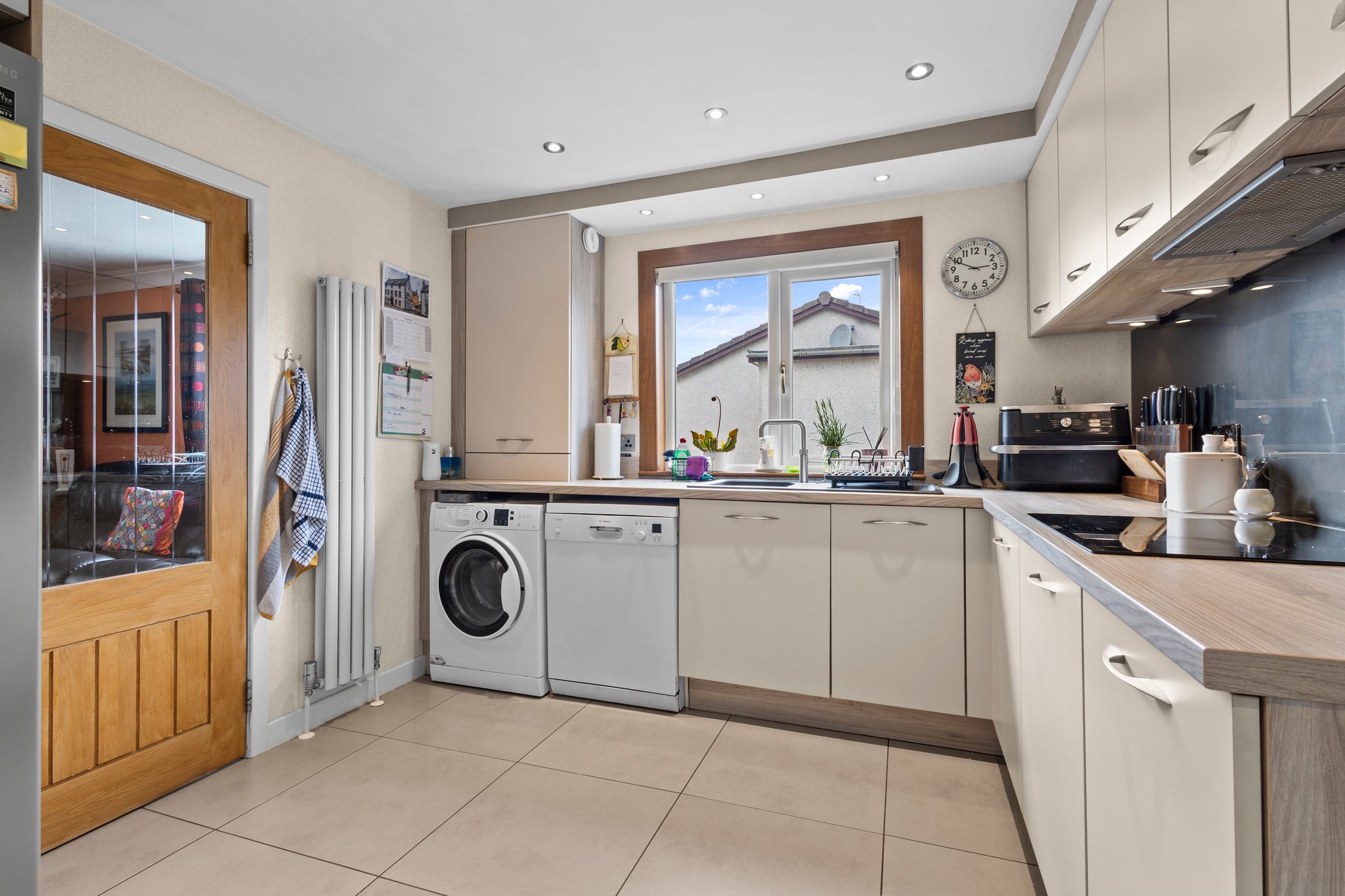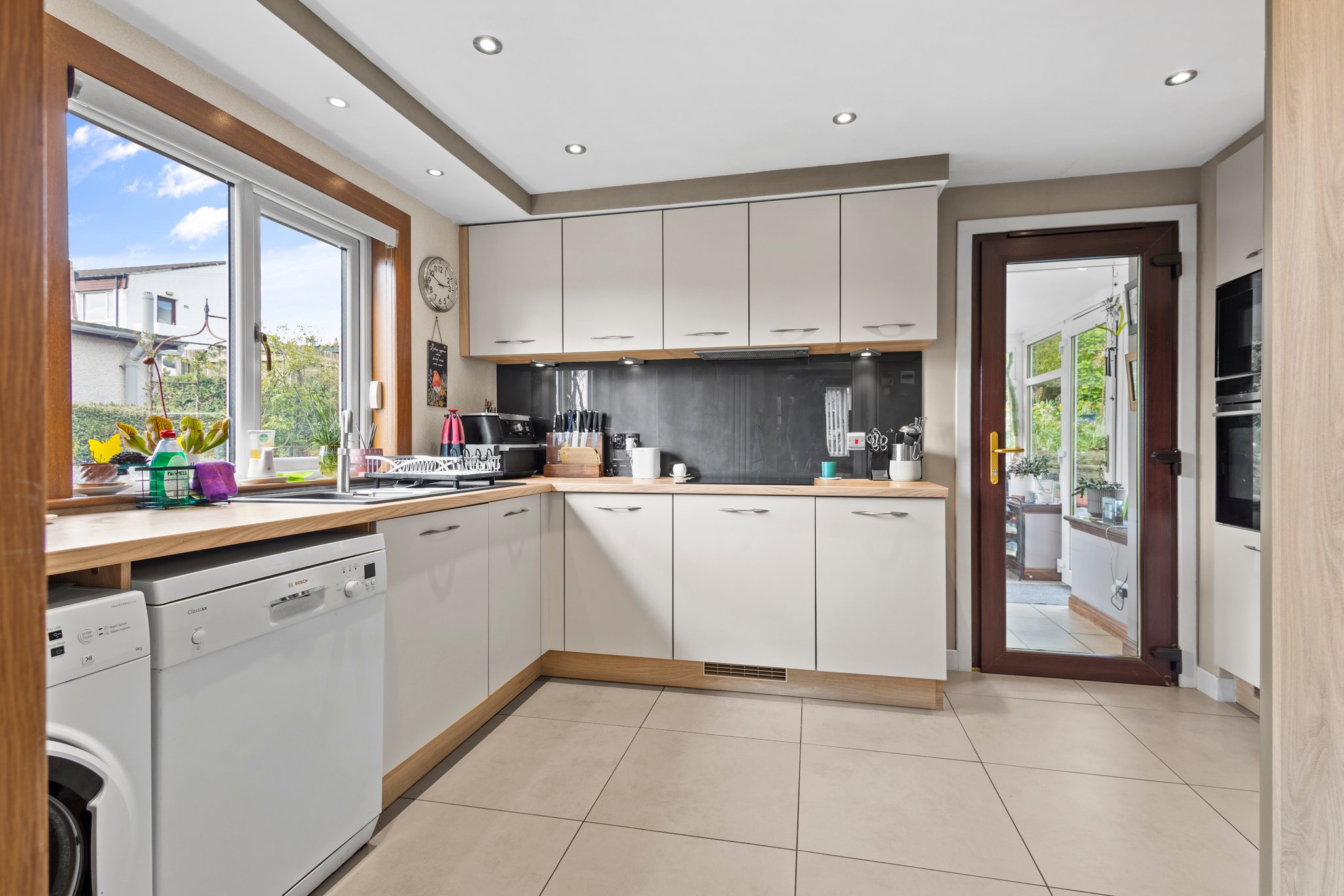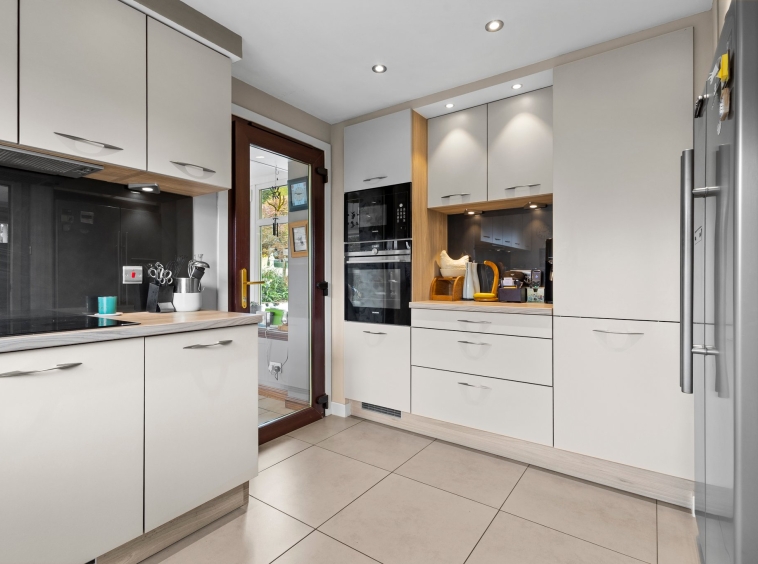 4.15m x 3.09m (13′ 7″ x 10′ 2″) Contemporary fitted kitchen providing a range of modern cream wall and base storage units with complementary work surfaces, composite sink and drainer, integrated double oven and induction hob. Plumbing/space for appliances including American style fridge/freezer, washing machine and dishwasher. Neutral decor, tiled flooring, ceiling spotlights, double glazed window to the side and door access to both the lounge and conservatory.