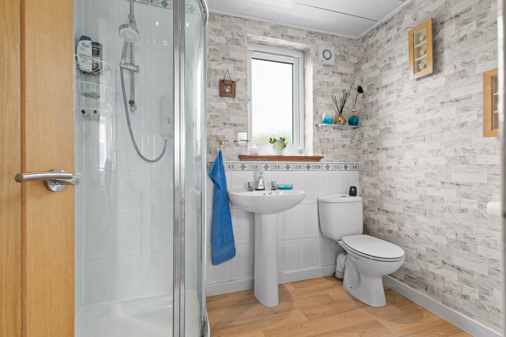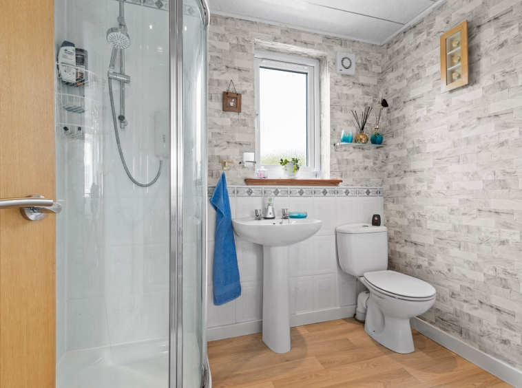2.31m x 1.91m (7′ 7″ x 6′ 3″) Completing the accommodation is the three piece shower room located on the upper level comprising of a wash hand basin, wc and shower cubicle with mains overhead shower. Contemporary decor, vinyl flooring, ceiling spotlights and double glazed opaque window to the rear.