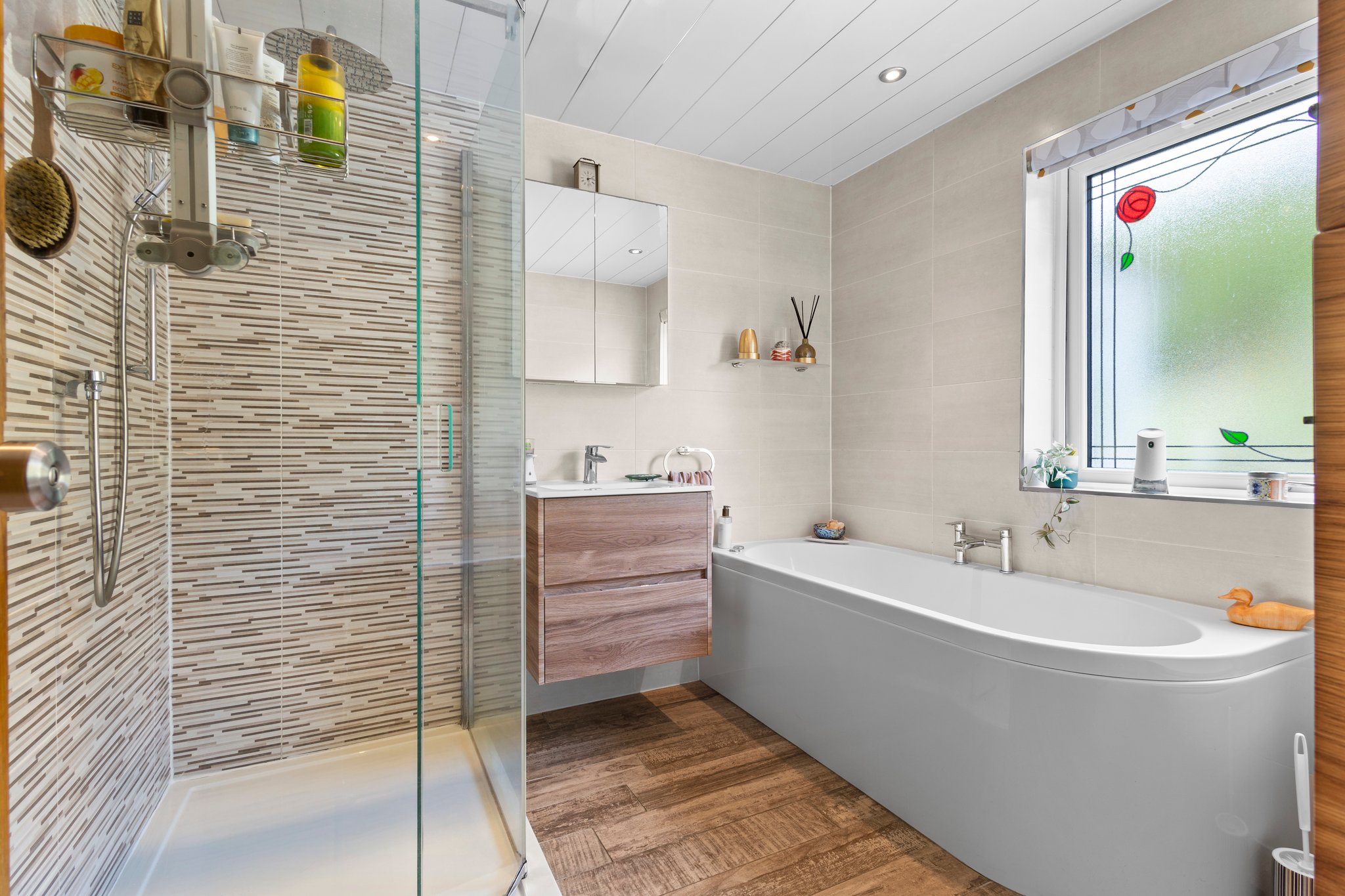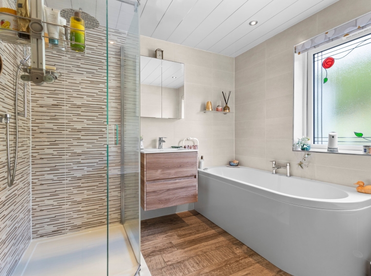 Impressive four piece family bathroom suite comprising of a wash hand basin with vanity storage, wc, bath and shower cubicle with mains overhead shower. Modern fully tiled walls and floor, ceiling spotlights, heated towel rail and a double glazed window to the rear.