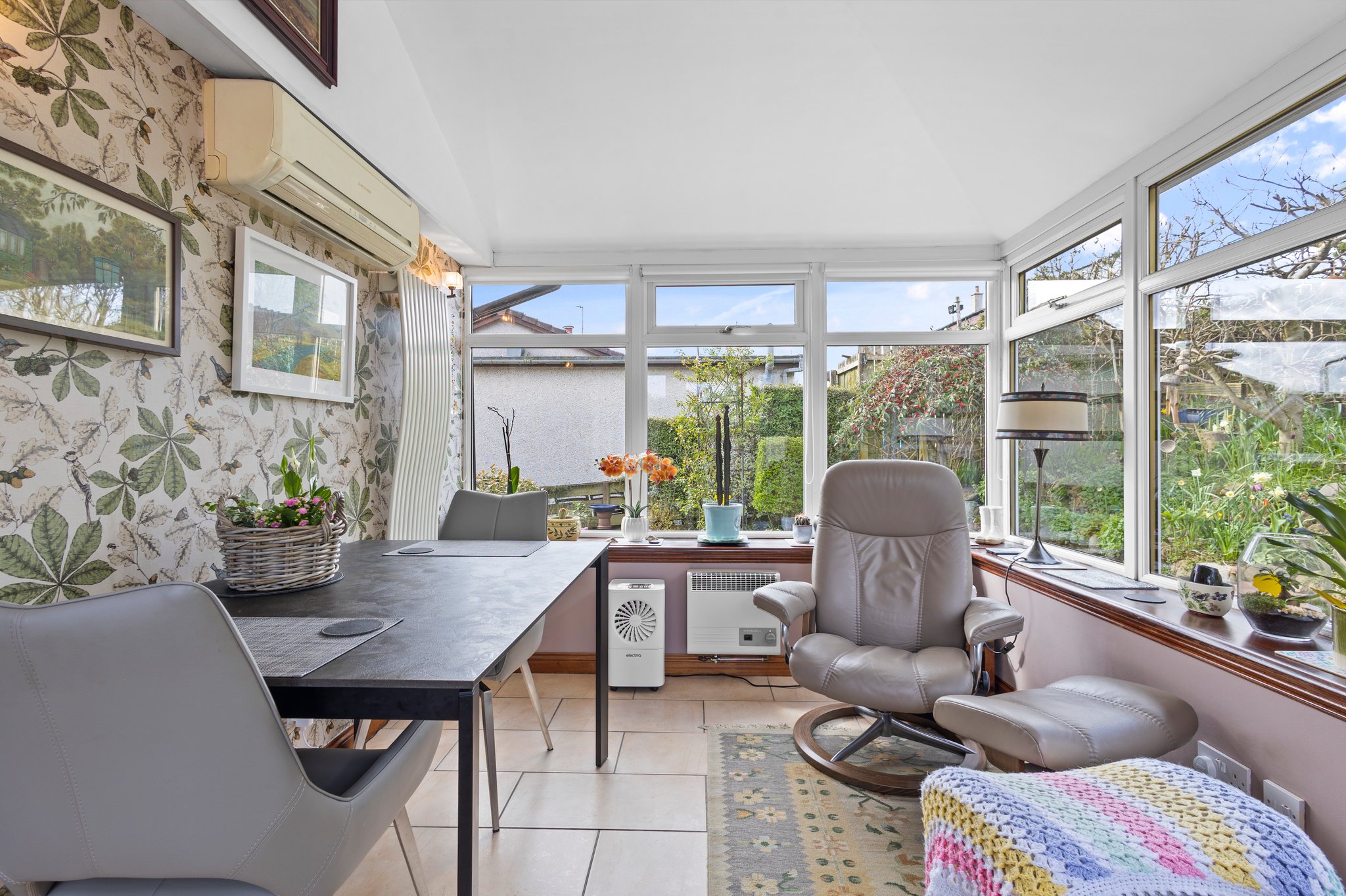 3.48m x 2.99m (11′ 5″ x 9′ 10″) With access via the kitchen, the Idyllic rear conservatory with double glazed windows on three aspects providing beautiful views of the private gardens, complete with stylish decor and tiled flooring.