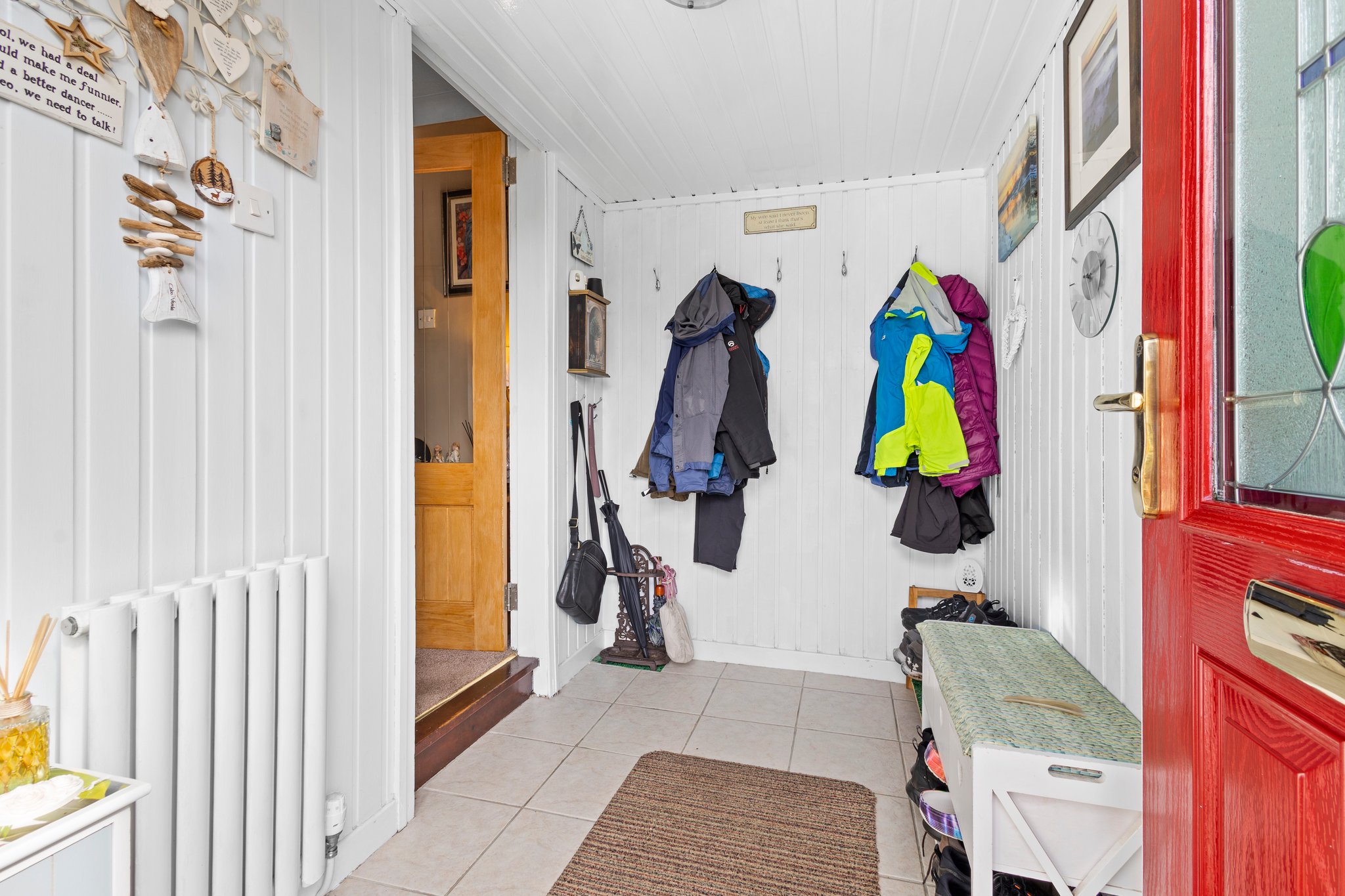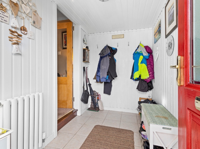 2.53m x 1.52m (8′ 4″ x 5′ 0″) Practical entrance porch offering neutral decor with wall paneling, tiled flooring and door access to hallway.
